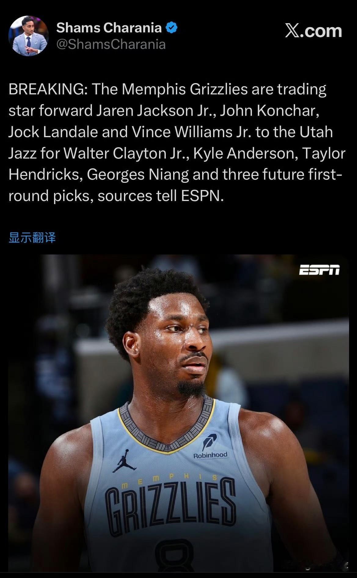 又一笔重磅交易来了! 据权威记者Shams报道:灰熊队将小贾伦-杰克逊、孔查尔、兰代尔、小文斯-威廉姆斯交易至犹他爵士队,得到克莱顿二世、安德森、亨德里克斯、尼昂和三个首轮签。 通过这笔交易,爵士队得到全明星前锋小贾伦-杰克逊,他将搭档马尔卡宁、乔治、凯斯勒组成球队的核心阵容,致力于盐湖城的崛起,下赛季剑指季后赛。而灰熊队则将围绕年轻资产彻底重建,球队手上的未来首轮签数量已经非常可观,下一步大概率会将莫兰特也交易出去,因为他已经不是球队的建队基石了,要重建就重建得彻底。 这是本赛季目前最重磅的一笔交易,随着交易截止日越来越近,仍有更多的交易在酝酿之中!