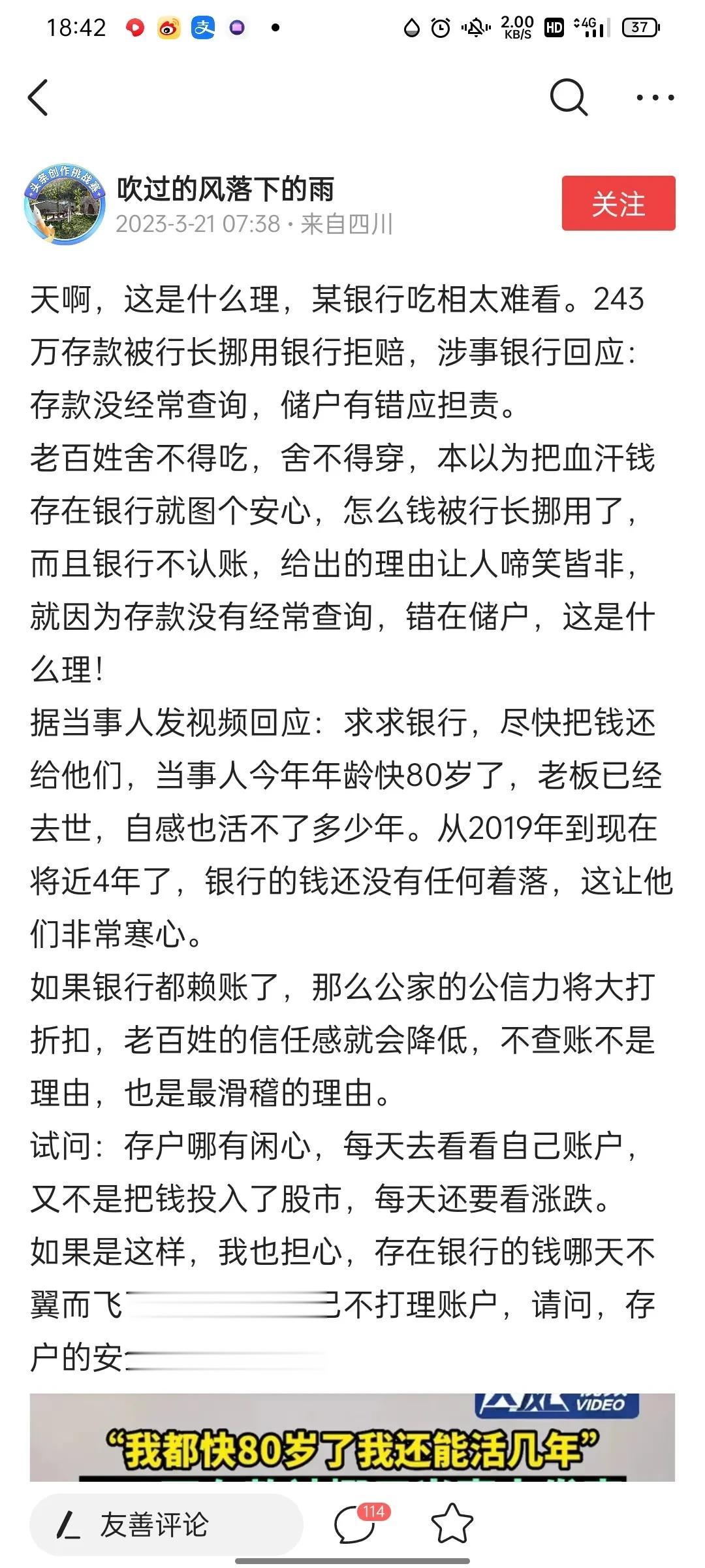 243万存款被银行行长挪用,一审法院判定银行赔偿储户存款,银行拒赔并且上诉,理由是:储户没有经常查询自己的存款,应自行承担损失。 江苏南京李先生经朋友介绍认识该行行长时某,为了帮助其完成揽储任务,李先生在该行存了243万元,10年期间李先生没有去银行查询自己银行存款记录,在李先生急需用钱的时候去取钱,却被告知存折没有钱了,存折流水记录都是假的。 李先生存钱没有进入银行,行长做假账然后自己取走了,钱没有存进银行,银行当然不承认了。 但是储户无法分辨自己的钱有没有存进银行,如果这样可以成为不还钱的理由,那么是不是行长都可以名正言顺盗取客户的钱而不用负责呢?我在银行存款当然找银行要啊? 银行靠什么生存?当然靠信誉啊?要是没有信誉的话谁敢存钱?你哪天往银行存100万,结果取钱的时候银行说钱没了,被行长盗走了你找行长吧?和本银行无关,这可能吗? 如果这样自己的存款哪天不翼而飞了该找谁负责呢?谁没事经常去银行查询自己的存款?