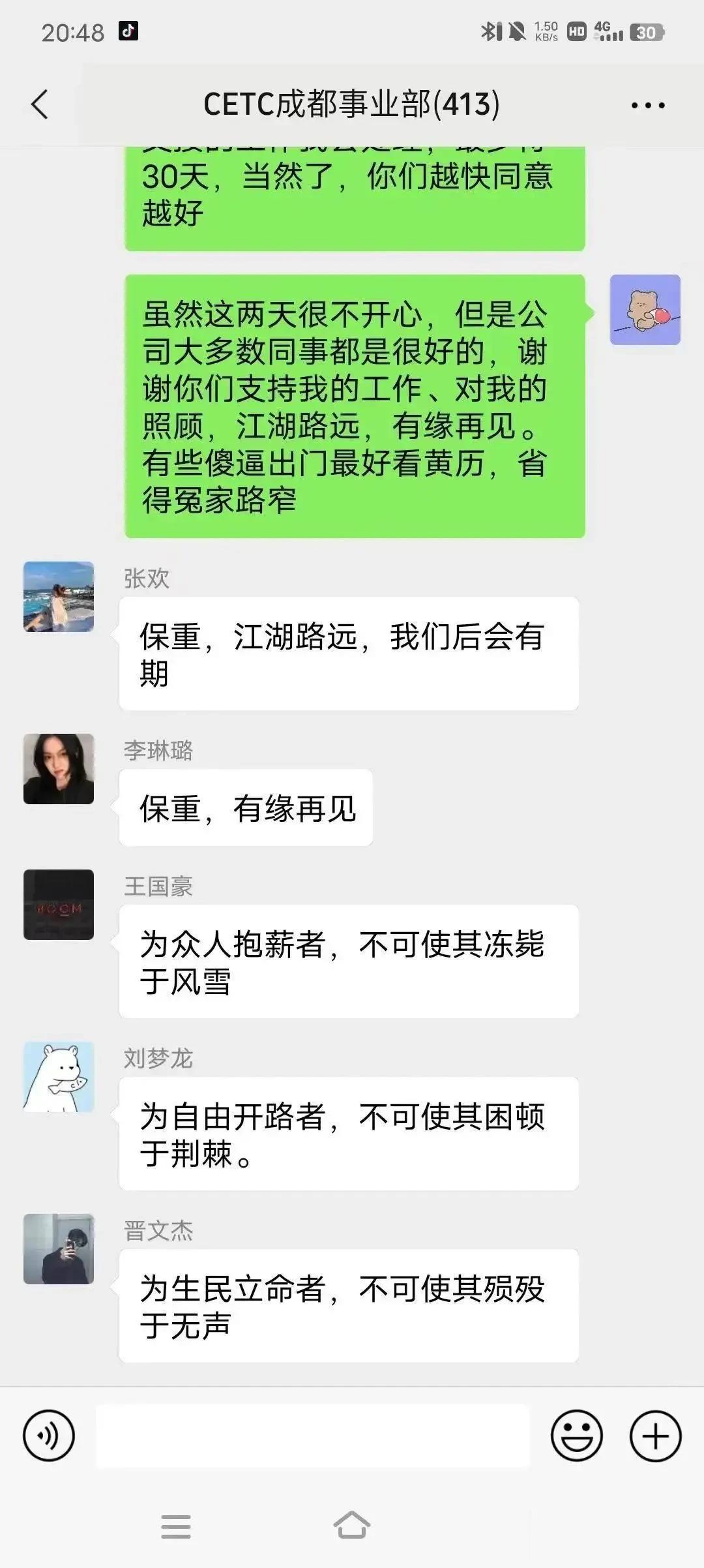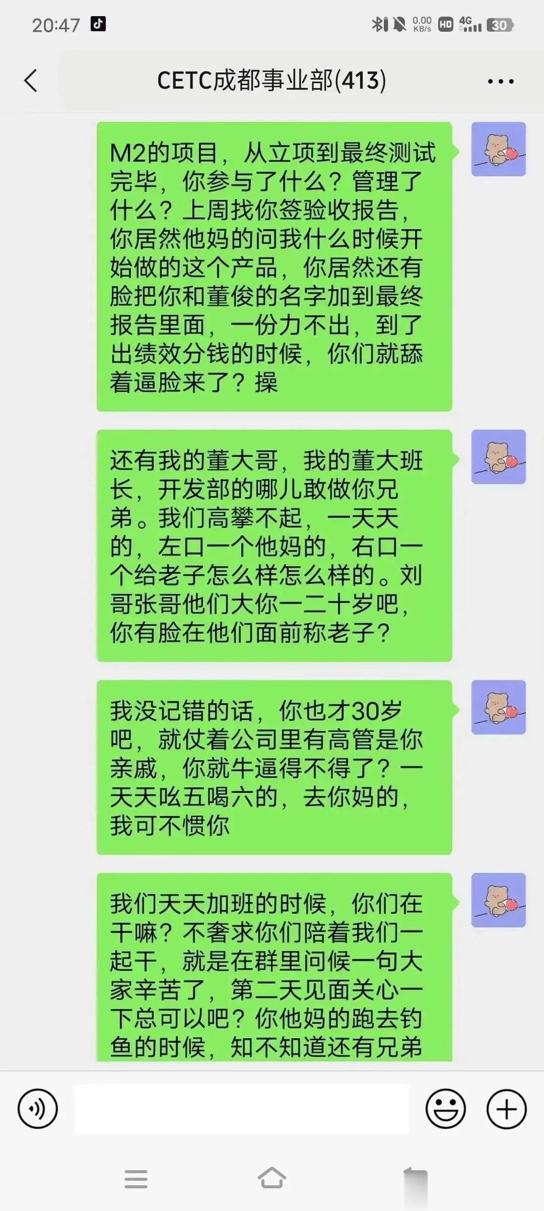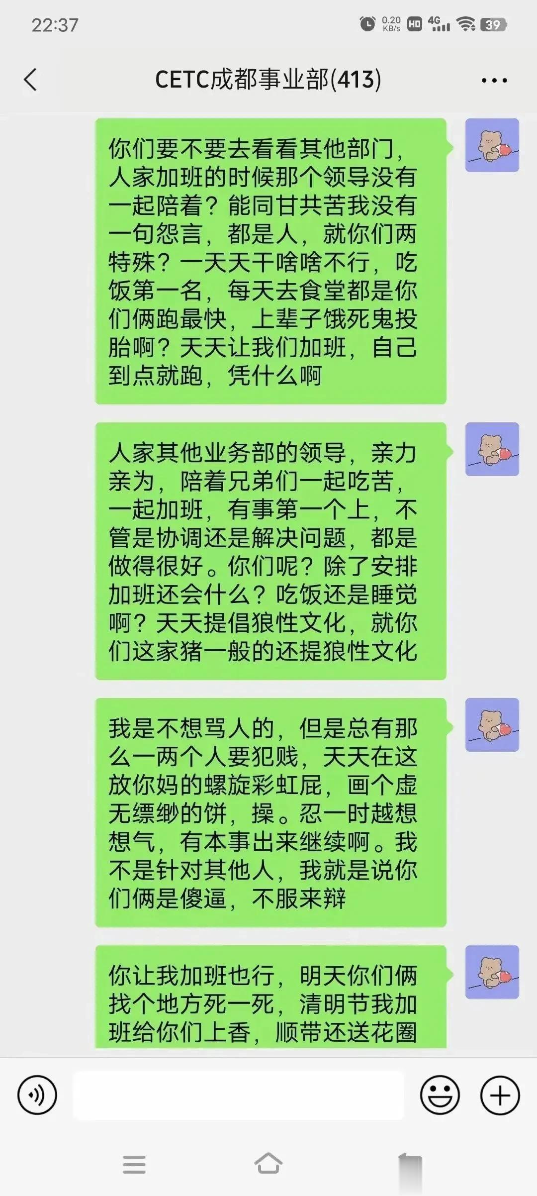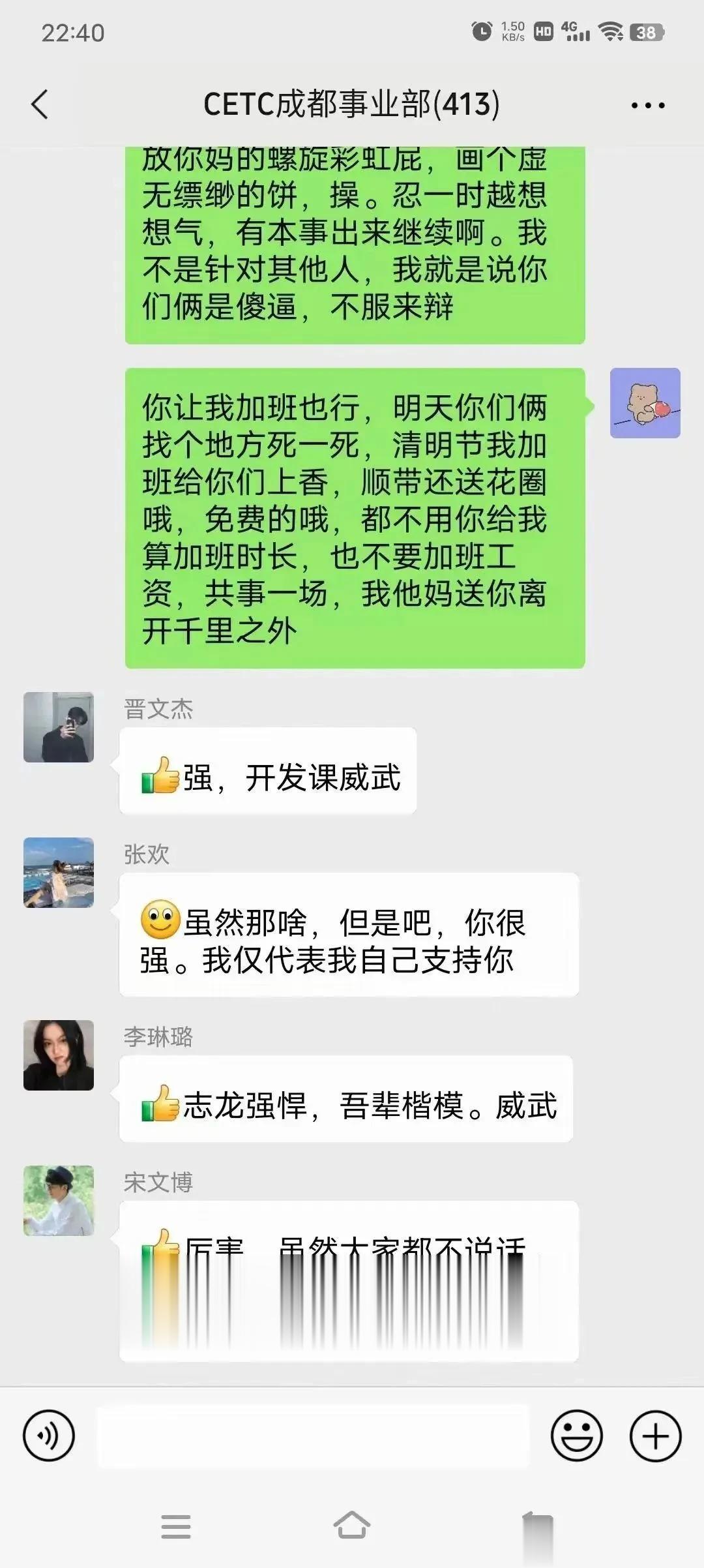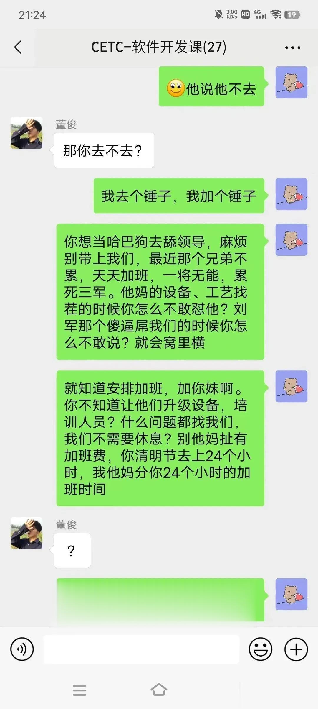 中国电科员工大骂领导登上热搜,这位员工没有因为对方是领导而顺从,而是把压抑多年的怒火全部宣泄出去了,这样的员工你方放眼全中国也找不出几个来啊? 别看键盘侠天天骂美国厉害,现实中在领导面前一个比一个怂,因为骂美国安全,骂领导失业了。 这哥们不是不加班而是反感把员工当驴一样使唤,这哥们终于爆发了大骂领导,估计也不想干了,所以才敢这样和领导说话。