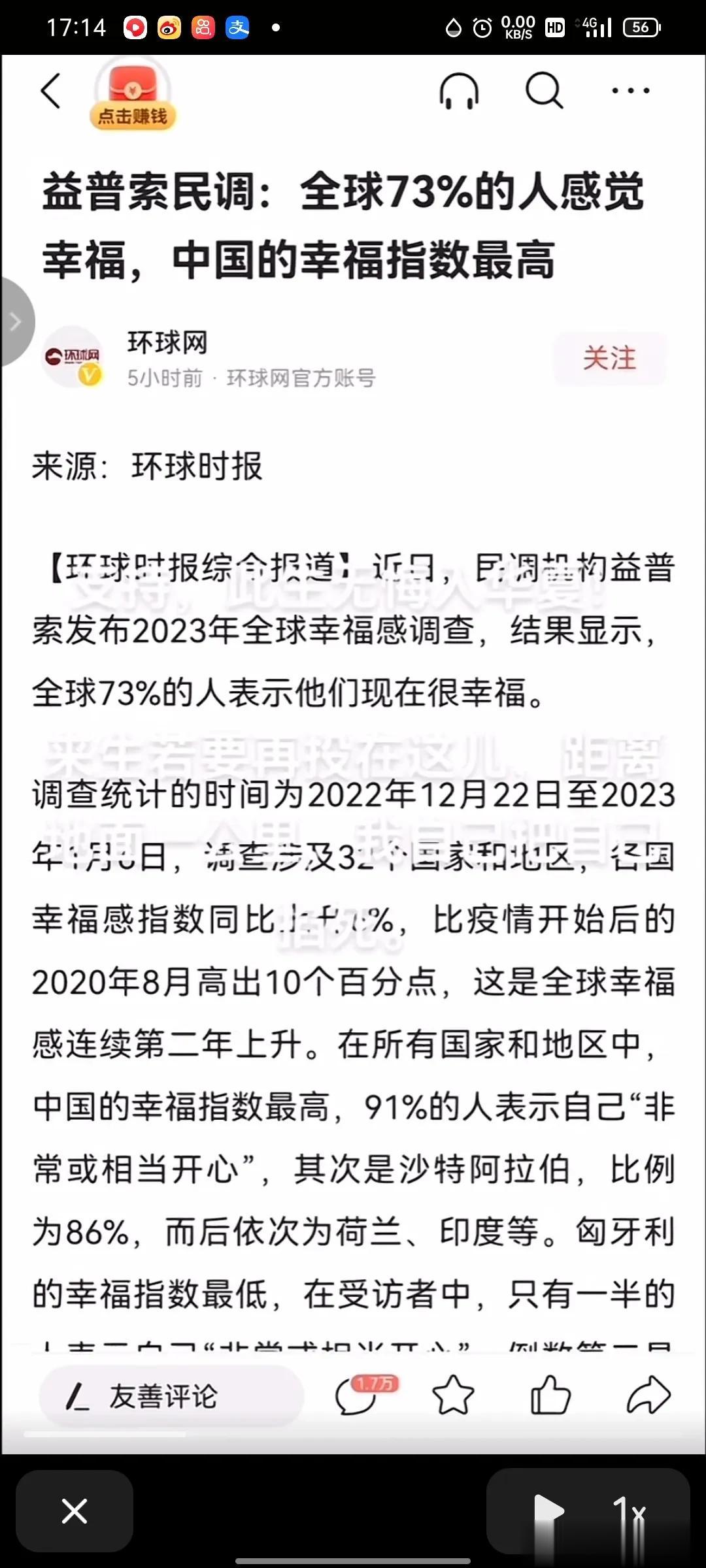 幸福感指数第一不是中国吗?