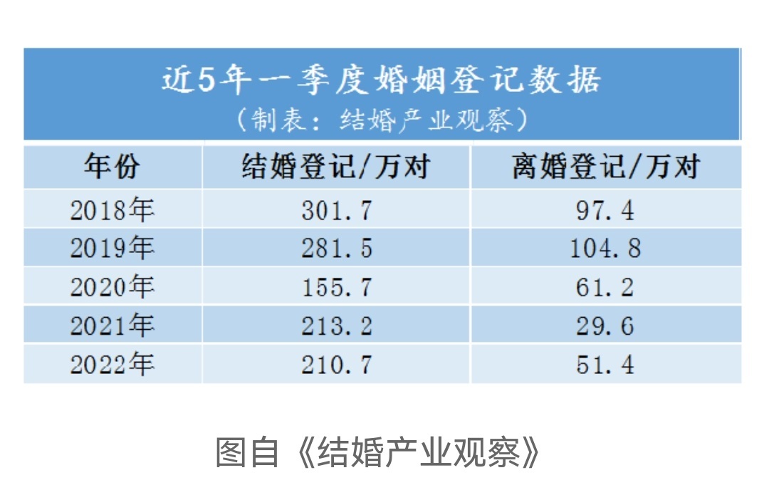 而在受到疫情明显干扰的2022年,第二季度、第四季度甚至比2021年下降20%以上。具体数据如下:2022年第一季度结婚登记量为210.7万对新人登记结婚,同比下降1.17%;2022年第二季度结婚登记量为162.5万对,较2021第二季度的203.4万对下降20.1%;2022年第三季度结婚登记量为171.3万对,较2021年第三季度结婚登记数量172万对近减少0.7万对新人;2022年第四季度结婚登记138.8万对,较2021年第四季度结婚登记数量175万对下降20.7%。
