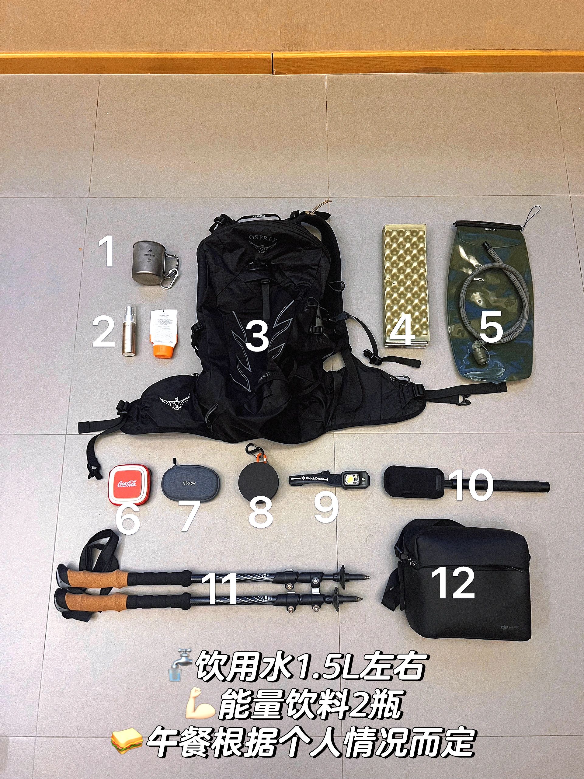 徒步装备,新手第一次徒步都带了什么.关于装备:图中我为大家标好了序号,其实有些是比较累赘也没有用到的,我会一一说明请看图.