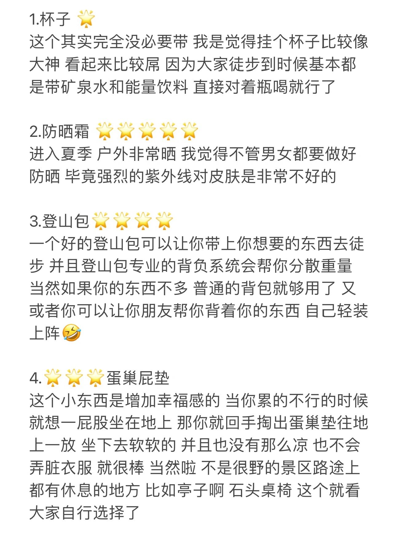 字数太多了只能写到图里了也方便大家保存。关于穿衣:我一开始是只穿了一件速干T的,后来感觉有点冷又晒就套上了皮肤衣,爬到一半时候,气温上来了,也觉得有点出汗就把打底的T脱掉了,只穿皮肤衣最后登顶的时候海拔比较高,风也大气温也低了就把冲锋衣套上了.墨镜非常重要,脸部的话虽然涂了防晒但是物理防晒更重要,可以选择户外面罩或者防晒口罩鞋子轻一点比较好.