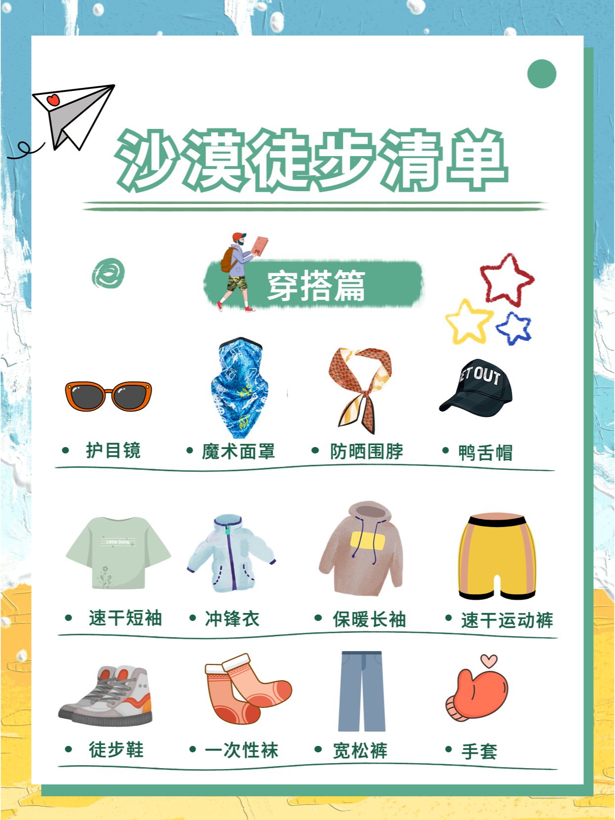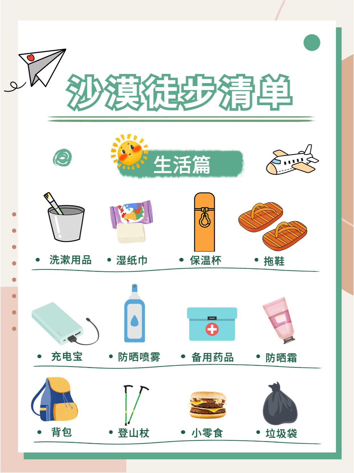 生活篇:洗漱用品:从简携带即可。生活用品:湿纸巾&干纸巾、保温杯、防晒喷雾、拖鞋、小干粮等。其他物品:登山杖(建议买一对,节省体力并且易保持平衡)充电器&充电宝(沙漠里的营地是有电的,充电宝可以在路上用)大背包(如果可以尽量带一个背包即可,行李箱能不带就不带)Tips:如果有小伙伴选择报名团,一定要提前问清楚提供物品清单,像上面提到的魔术面罩、手套、登山杖、帽子等装备都会提供,避免重复携带装备。以上就是小院子为大家带来的沙漠旅行必备物品清单。当然,除了上面的物品,你也可以携带一些个人必备药品(如晕车药、感冒药、驱蚊水等),祝大家能够有一个美好的沙漠之旅(关于沙漠旅行相关的知识,你还想知道哪些评论区提问,下篇笔记安排着)