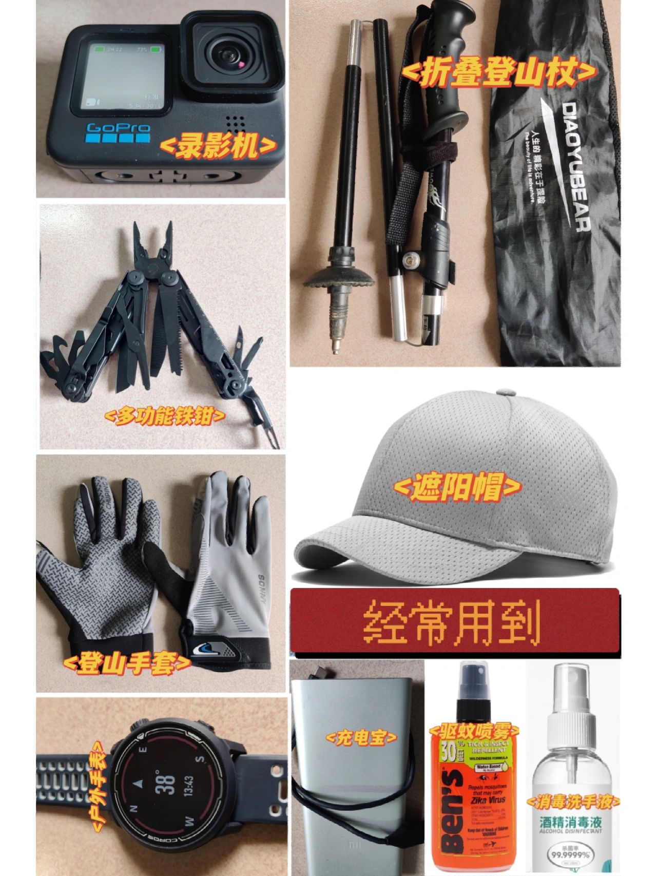最好选择有Vibran技术的鞋,抓地力强很多,正常徒步鞋也够用手套[手套R],攀爬或者下滑需要准备其他遮阳帽、渔夫帽、护膝(攀爬要)、护肘、魔术头巾、冰袖等二、徒步装备经常用到的背包,[背包R]一定要带,摔倒背面起到缓冲作用,专业的包减压背负,30升轻徒基本够用登山杖,轻徒建议买折叠,方便收缩录影机,选好的能摄影也能当记录仪手表,记录更精准,好的手表手机导航都省了多功能铁钳,充电宝和线、可湿水纸巾、垃圾袋、驱蚊喷雾(不要用香的,刺激性味效果好)