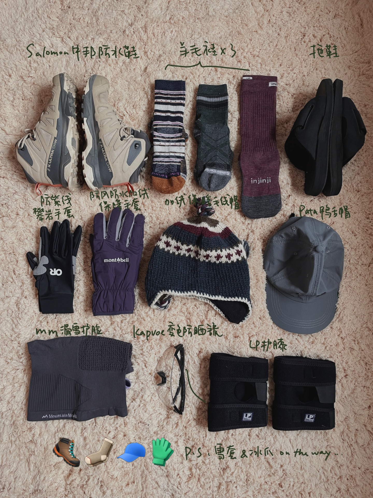 其他徒步必备:鞋&袜1salomon中邦防水徒步鞋(徒步穿)2拖鞋(住宿穿)3羊毛袜3帽1patagonia鸭舌帽2加绒毛线帽手套1OR防晒手套(薄款:防紫外线)2montbell厚手套(厚款:防风保暖)LP护膝雪地装备.1黑冰雪套19齿冰爪2mountain_moods滑雪护脸(比魔术头巾保暖些)3kapvoe变色防晒镜(防雪盲)