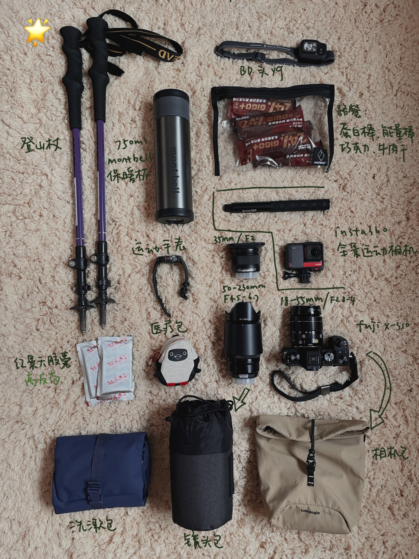 其他相机、登山杖、头灯、保温杯、洗漱用品、防晒霜、医药包、路餐、纸巾、垃圾袋