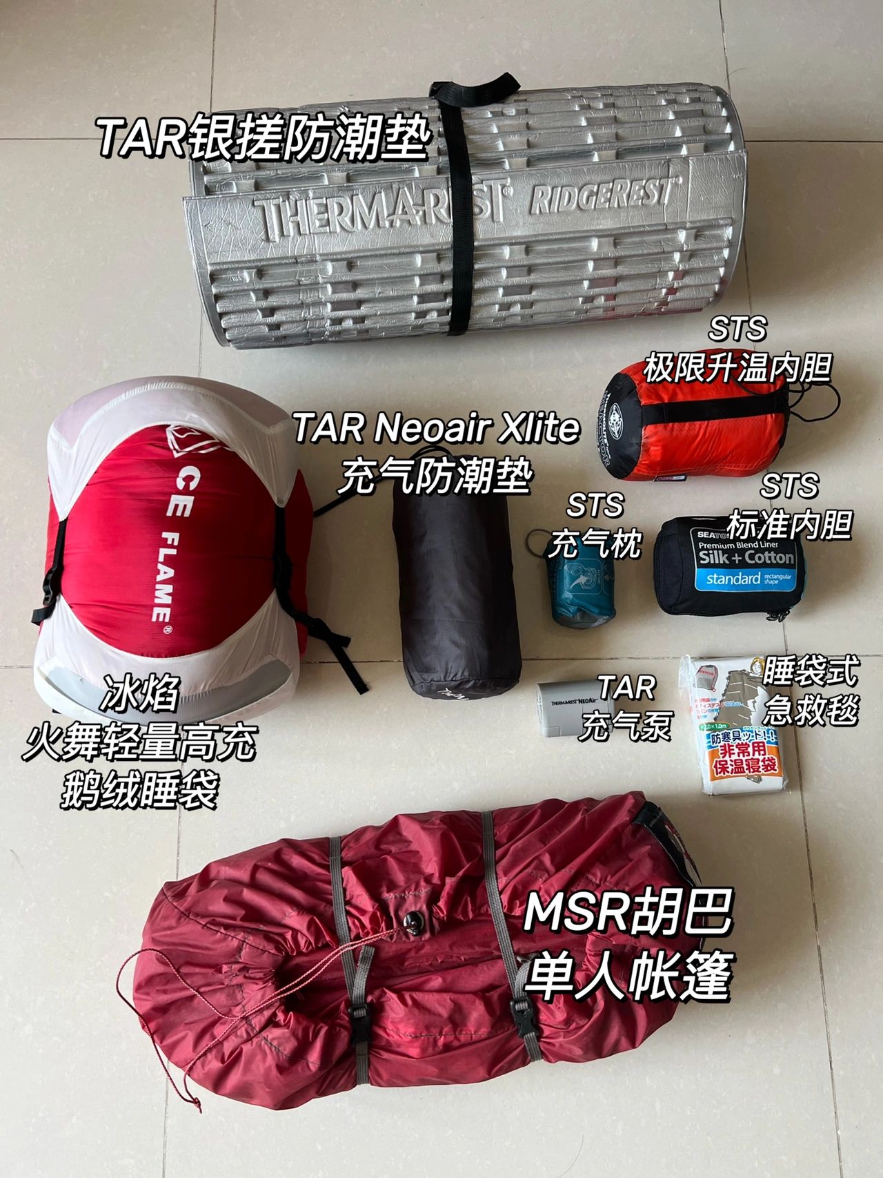 4.TAR充气泵很有用,但不能充到满,最后要靠自己吹两下。充气需要5分钟,我一般一到营地就会开始充气,在帐篷搭好的时候,气也充好了。5.TAR银搓防潮垫露营装备党没有TAR的蛋槽或银搓是不完整的。它对比充气垫的好处是不怕漏气,铺的快,去高海拔地区更保险。6.Sea_to_summit睡袋内胆羽绒睡袋不能经常清洗,一定要用内胆,干净又卫生,而且贴身用内胆真的更舒适。sts的极限升温内胆号称升温15度,我对比存疑,但提升5度是完全没问题的,是对睡袋温标非常好的补充。