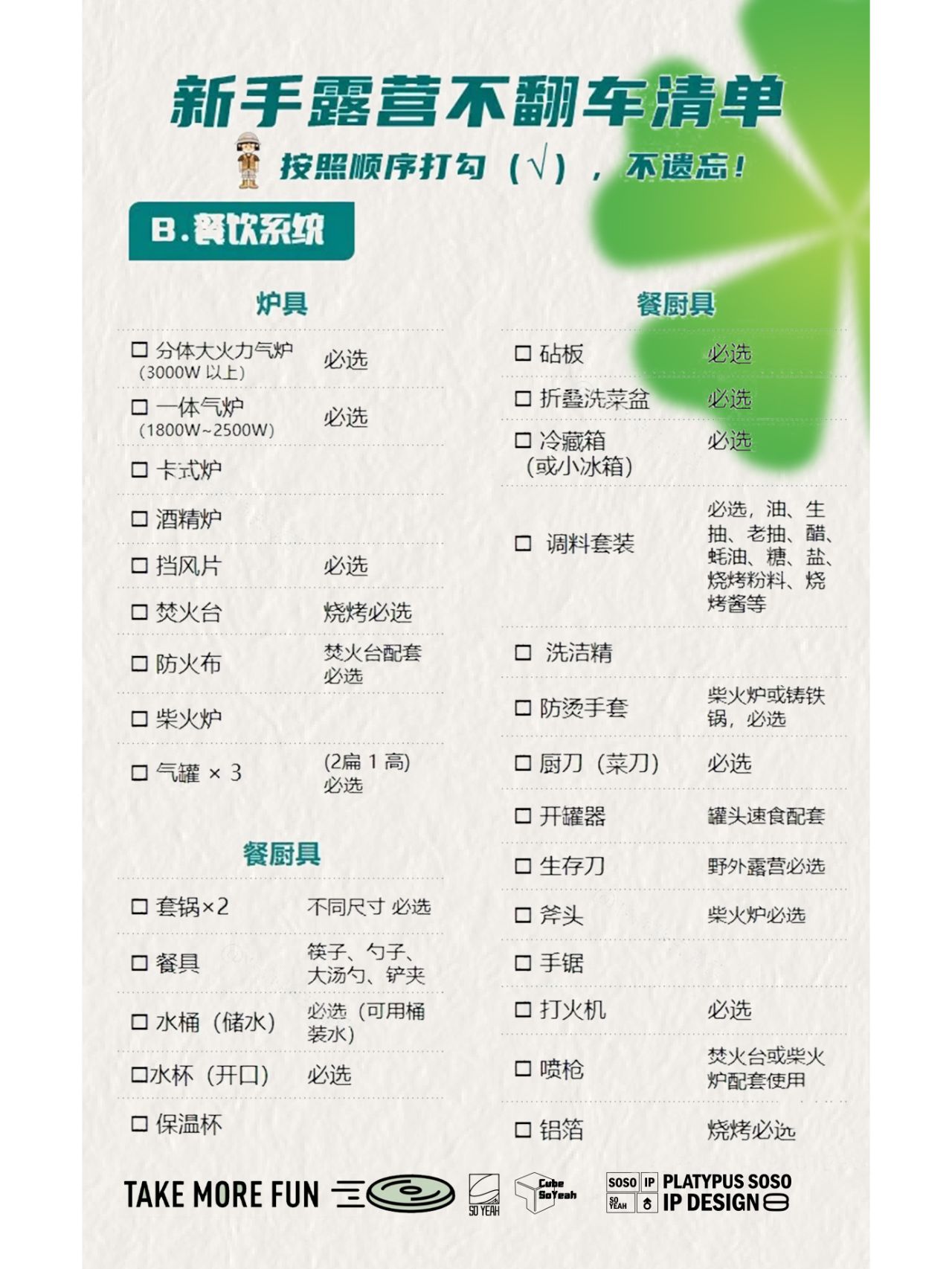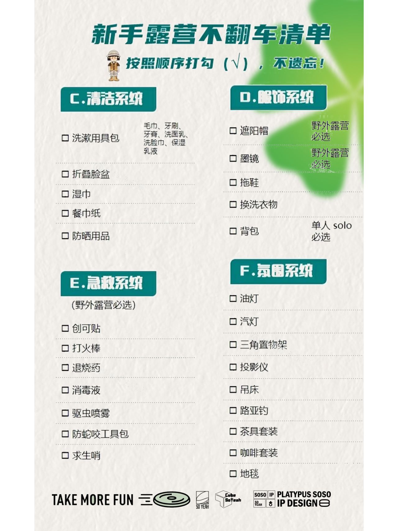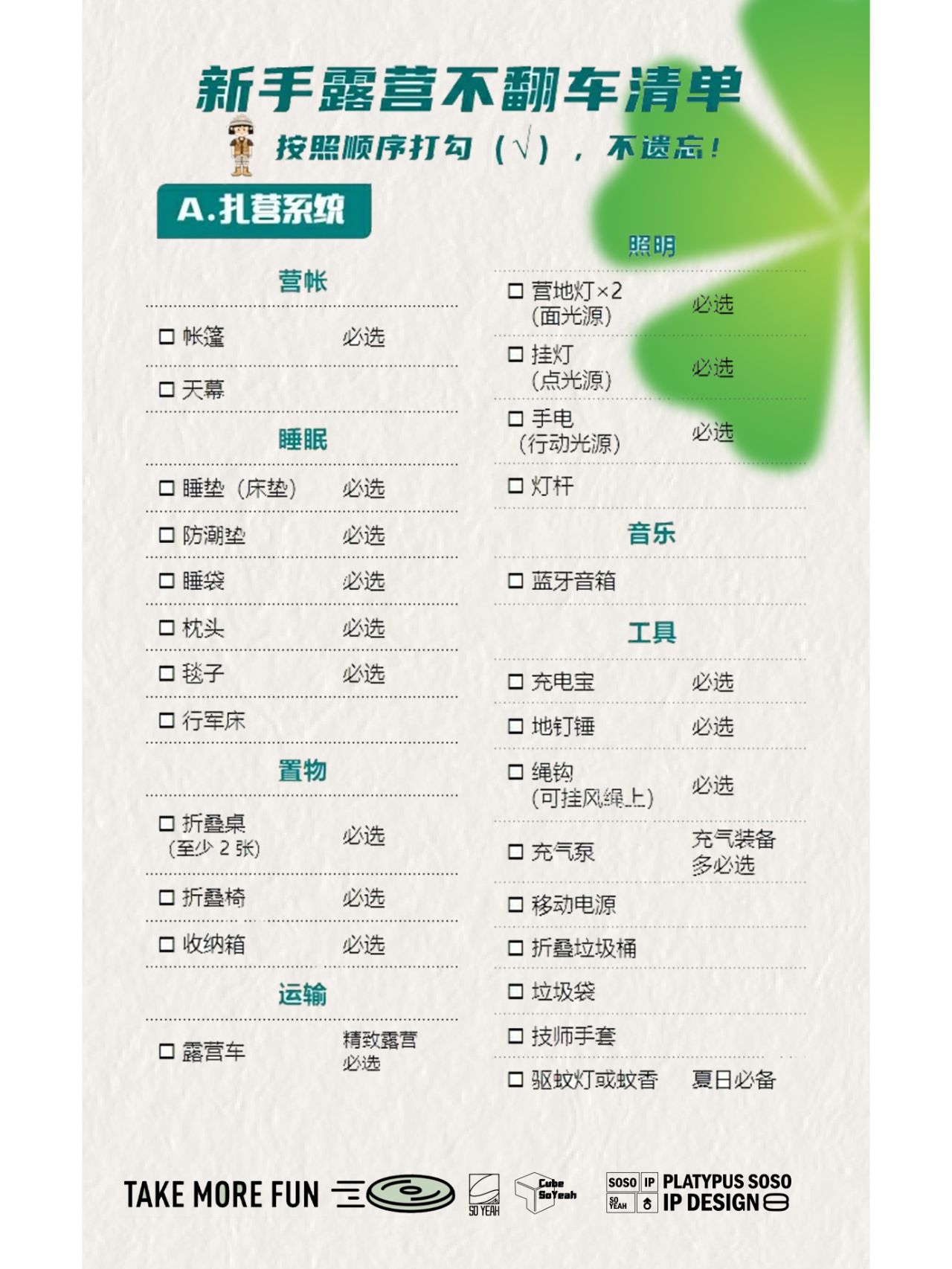 出门露营要准备的装备非常细,吃穿住行都要带齐全,稍不留神就可能给忘了。推荐一个小技巧:我准备了一张超超超全的露营装备清单,平时可以按照下面的分类依次收纳。出发之前,按照顺序打勾,直接带走就好了。这样轻轻松松露营,不遗忘!A。扎营系统一、营帐:1。帐篷2。天幕二、睡眠1。睡垫(床垫)2。防潮垫3。行军床4。睡袋5。枕头6。毯子三、置物1。折叠桌(至少_2_张)2。折叠椅3。收纳箱四、照明1。营地灯×2(面光源)2。挂灯(点光源)3。手电(行动光源)4。灯杆五、音乐1。蓝牙音箱六、工具1。充电宝2。移动电源3。地钉锤4。绳钩(可挂风绳上)5。折叠垃圾桶6。垃圾袋7。充气泵8。技师手套七、运输1。露营车B。饮食系统一、炉具1。分体大火力气炉(3000W以上)2。一体气炉(1800W~2500W)3。卡式炉4。酒精炉5。挡风片6。焚火台7。防火布8。柴火炉9。气罐×3二、餐厨具1。套锅×22。餐具3。水桶(储水)4。水杯(开口)5。保温杯6。砧板7。折叠洗菜盆8。冷藏箱(或冰箱)9。调料套装10。洗洁精11。防烫手套12。厨刀(菜刀)13。开罐器14。生存刀15。斧头16。手锯17。打火机18。喷枪19。铝箔C。清洁系统1。洗漱用具包(毛巾、牙刷、牙膏、洗面乳、洗脸巾、保湿产品)2。折叠脸盆3。湿巾4。餐巾纸5。防晒用品D。服饰系统1。遮阳帽2。墨镜3。拖鞋4。换洗衣物5。背包E。急救系统(野外露营必选)1。打火棒2。退烧药3。消毒液4。驱虫喷雾5。防蛇咬工具包6。求生哨7。创可贴F。氛围系统1。油灯2。汽灯3。三角置物架4。投影仪5。吊床6。路亚钓7。茶具套装8。咖啡套装9。地毯