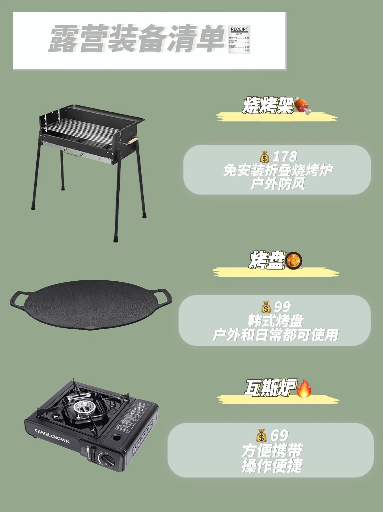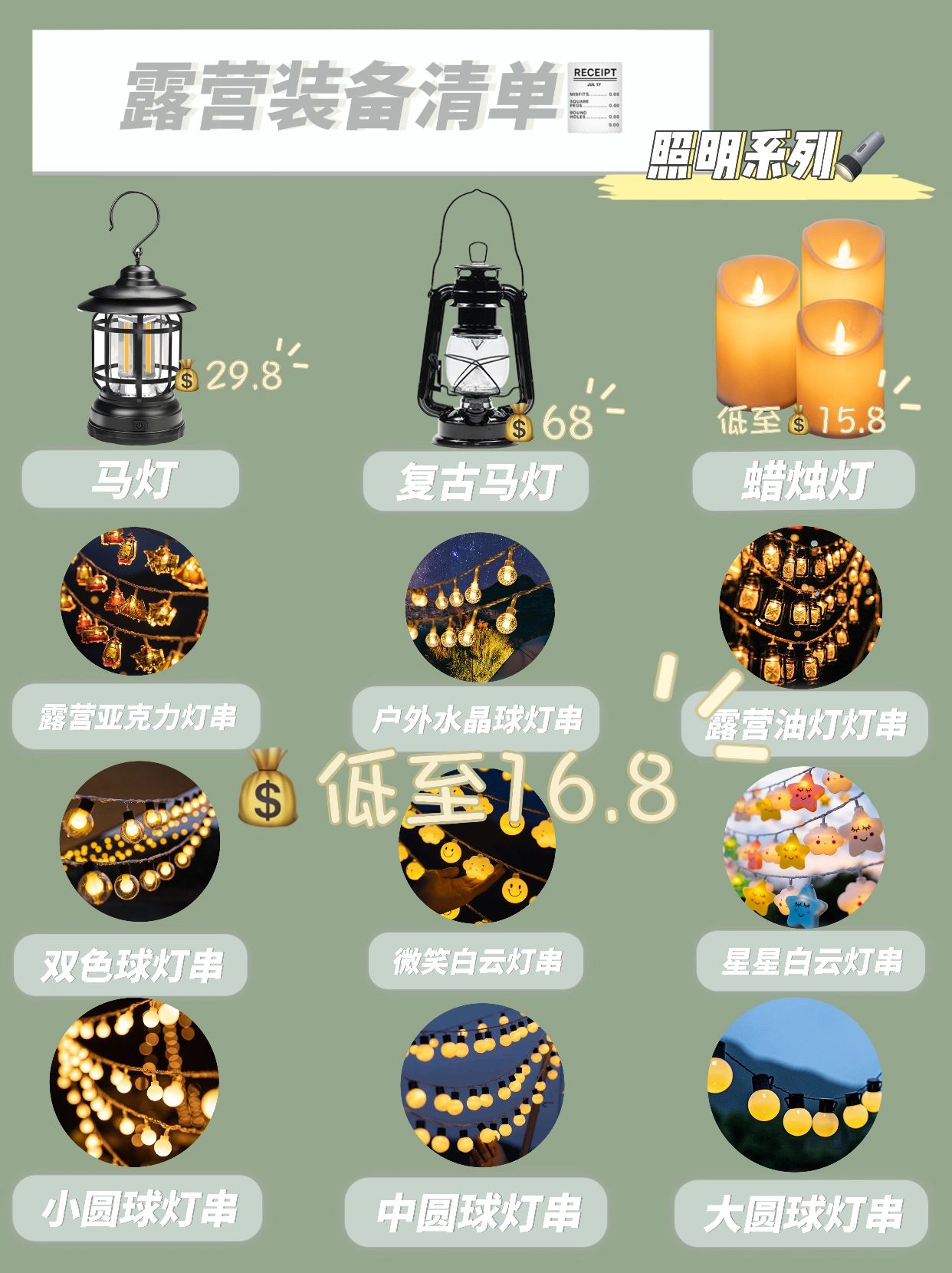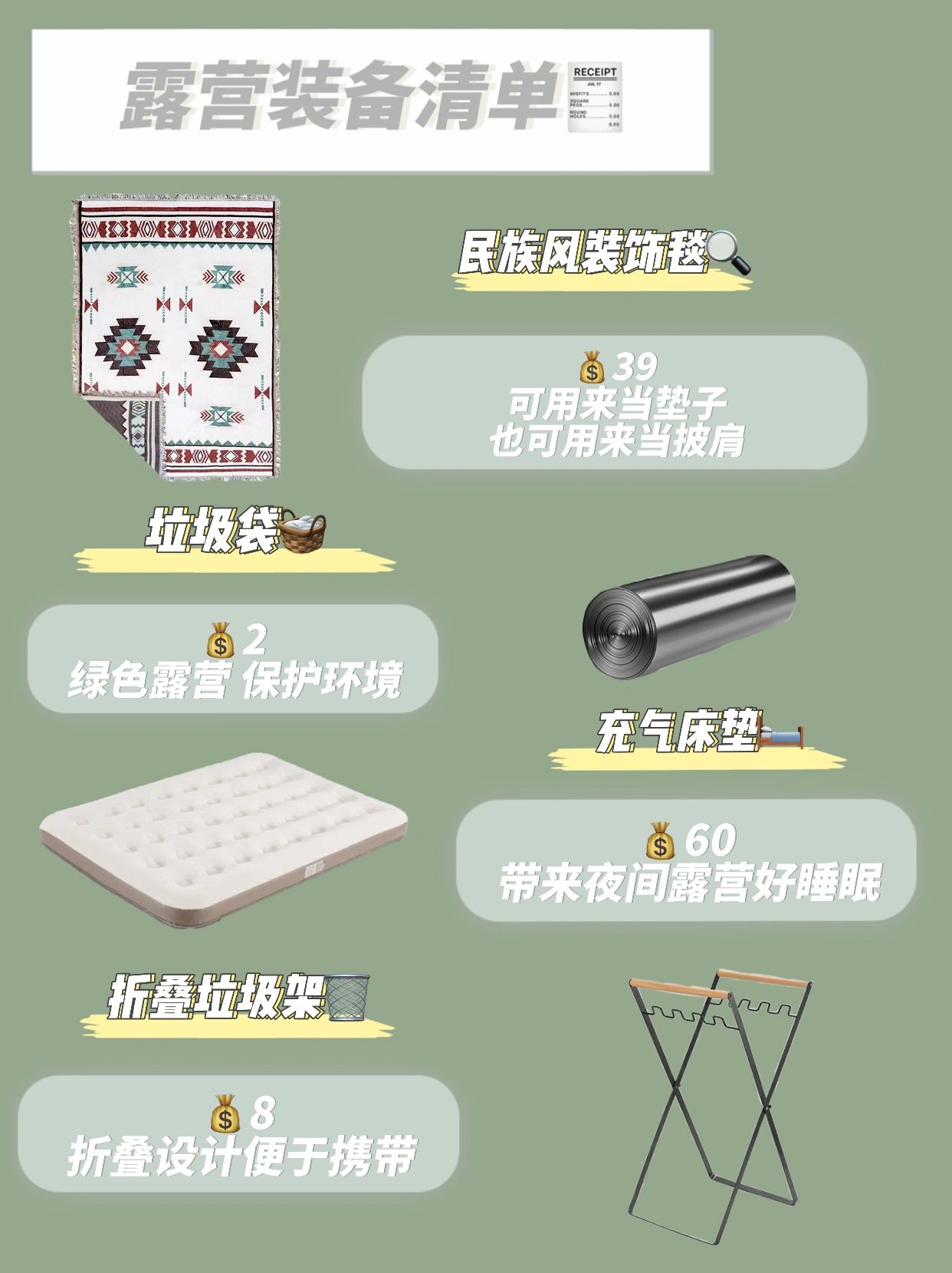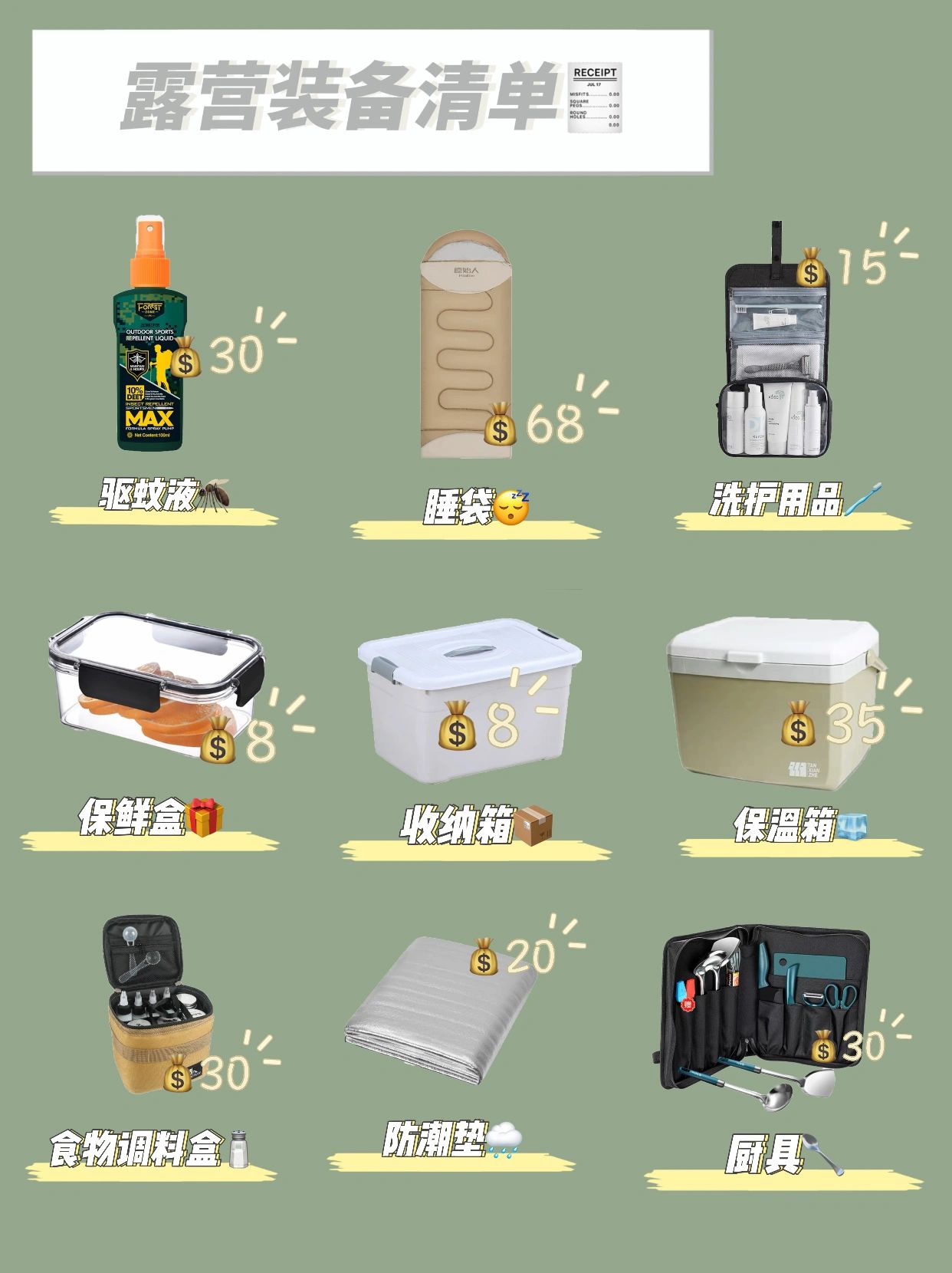 露营装备不需要太多,但需要精简这两天我整理了一份有关过夜的户外露营清单,请查收~露营设备(必备品)首先是露营需要的大件!!帐篷天幕帐篷营地推车(我认为这是刚需,因为真的很方便)露营收纳箱卷蛋桌克米特椅(有了这些户外露营就成型啦~)饮食类(刚需品)可以吃烧烤,也可以烧菜。烧烤架烤盘瓦斯炉(当然也可以配备一些烧水壶之类的,看个人需求哦!)保温壶长气罐垃圾袋、折叠垃圾架食物保鲜盒保温箱(保存新鲜食材,也可带冰镇饮料[偷笑R])厨房用具、调味盒(建议卖一整套,这样方便收纳)生活类(刚需品)过夜的话,更需要一些生活类的产品!移动电源(可以手机充电,灯具充电等)毯子(可以用作地垫也可以用来当披肩保暖)充气床垫(充气式携带方便,带来精致好睡眠)、充气泵驱蚊液(不管是蚊香还是驱蚊贴,在户外都是需要配备的)医药箱(图片中没有加,有需要的宝子自备哦)睡袋(过夜露营必备品!)洗护用品(牙膏、牙刷、洗面奶、补水品、毛巾等等,宝子们按需求佩戴)防潮垫换洗衣物湿巾、纸巾折叠脸盆照明系列(必备品)油灯马灯露营照明灯氛围装饰灯装饰灯串手电筒其他需要物品(非刚需)为了露营更精致,更具有氛围感!投影仪吊床茶具套装三角置物架打火机音响…属于露营的时期到啦~要露营的宝宝们看到这篇笔记,希望对你们会有帮助新手宝子可以从不过夜开始,慢慢的熟悉和必须要的东西,装备和氛围物品可以慢慢添置,这个过程也很美好图中价格均为折中的参考价~