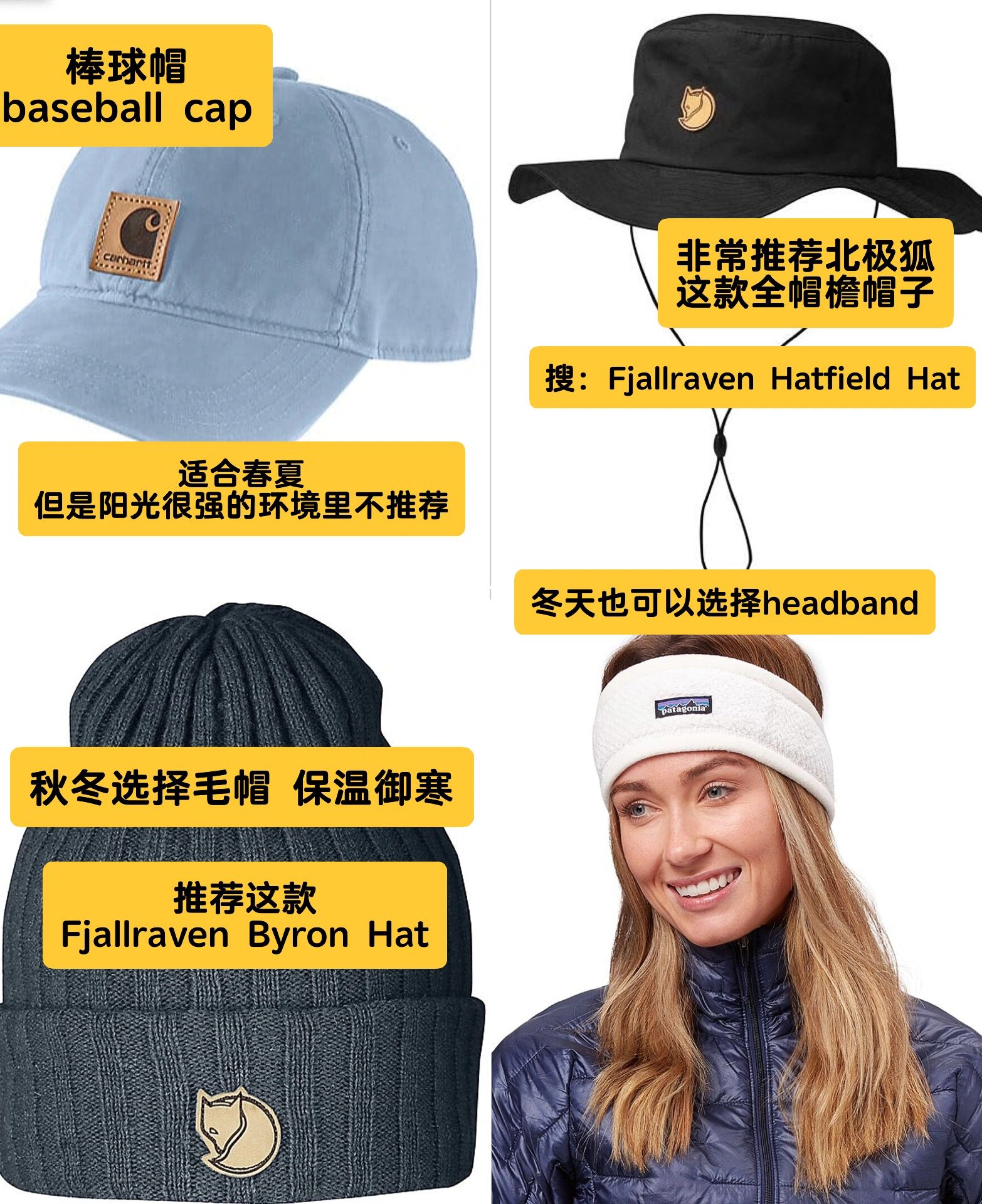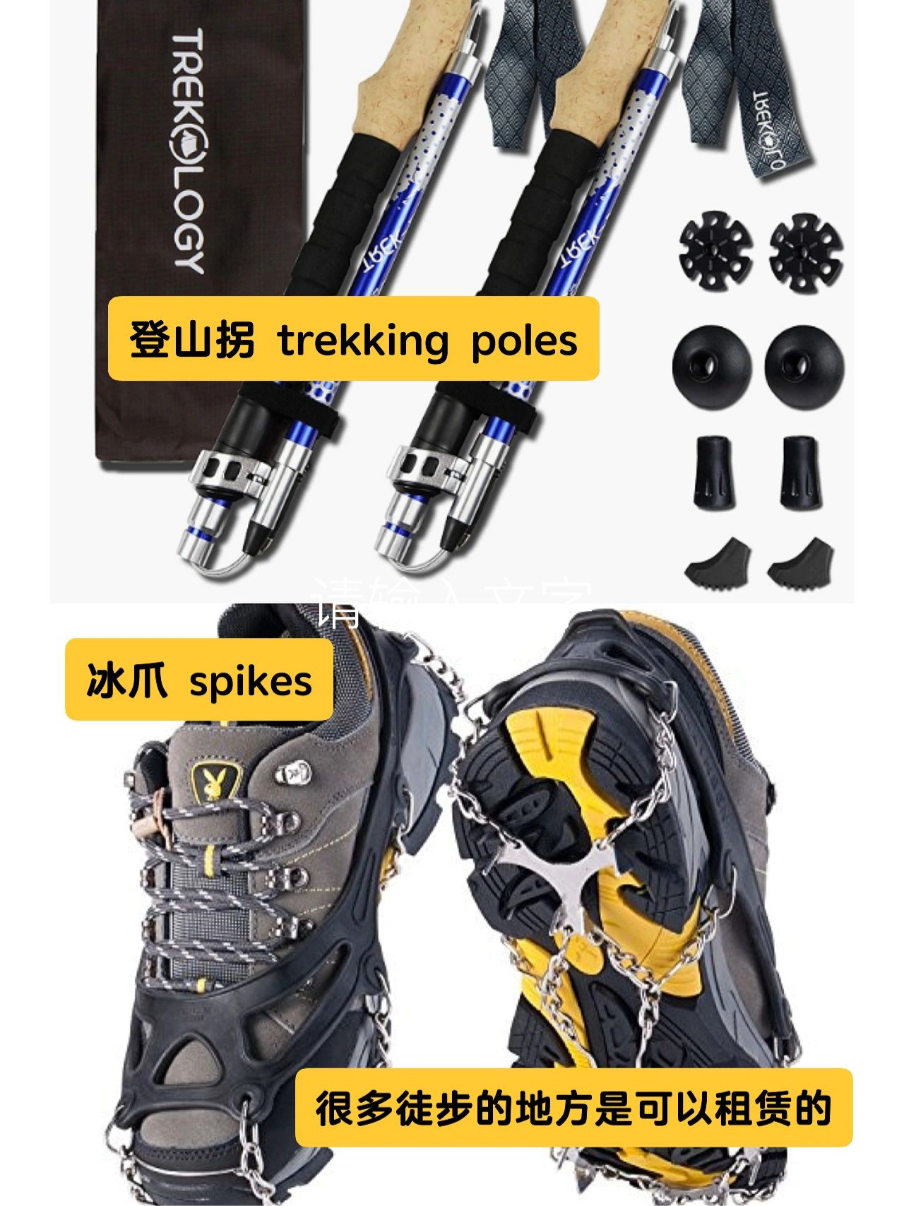 1背包backpack对于当天返回的徒步,建议买一个40L以下的徒步背包推荐Osprey家的背包女士:tempest30或sirrus36男士:talon33或stratos362徒步鞋Footwear徒步鞋鞋底更厚能更好地保护我们的脚,抓地力强防滑。推荐入门级别Columbia系列注意:不管什么品牌新的徒步鞋一定磨合过再带去徒步。首选中高帮徒步鞋避免崴脚3袜子徒步袜首先材质是羊毛(wool),透气性好保暖还防臭。袜子高度一般高于鞋帮以防磨脚,通常会选择crew_socks推荐品牌darntough4衣服徒步穿衣应该遵循多层原则内层:不要棉质。推荐常见的合成纤维面料,比如聚酯纤维。天气比较暖和的情况就选择lightweight英文搜base_layer_topsbottoms中间层:推荐抓绒衣(fleece_jacket),也可以选择轻薄的羽绒服(puffer_jacket)外层:防风防雨的外套(Rain_jacket),_最好选带拉链和帽子的5帽子春夏秋选择遮阳帽(full_brim_trailer_hat)注意防晒指数(UPF30)_和帽檐长度(3inch)。最好是快干防水材质(Gore-Tex),下巴有系绳可抵御强风。推荐的帽子在图66轻便雨衣搜索关键词:lightweight_hooded_rain_poncho7水杯强烈推荐_Nomader_可折叠水杯,自重轻还极其耐用8登山杖能有效的保护膝盖。一般国家公园附近都可以租到登山杖,但是经常出行的可以亚马逊买一副。推荐_trailbuddy_trekking_poles_铝合金制,轻便性价比高。9冬季有雪的地方需要冰爪_spikes头灯_headlamp_和备用电池_batteries1挂眼镜的绳子_eyewear_retainer2墨镜_sunglasses3防晒霜_sunscreen4纸质地图5急救箱_first-aid_kit