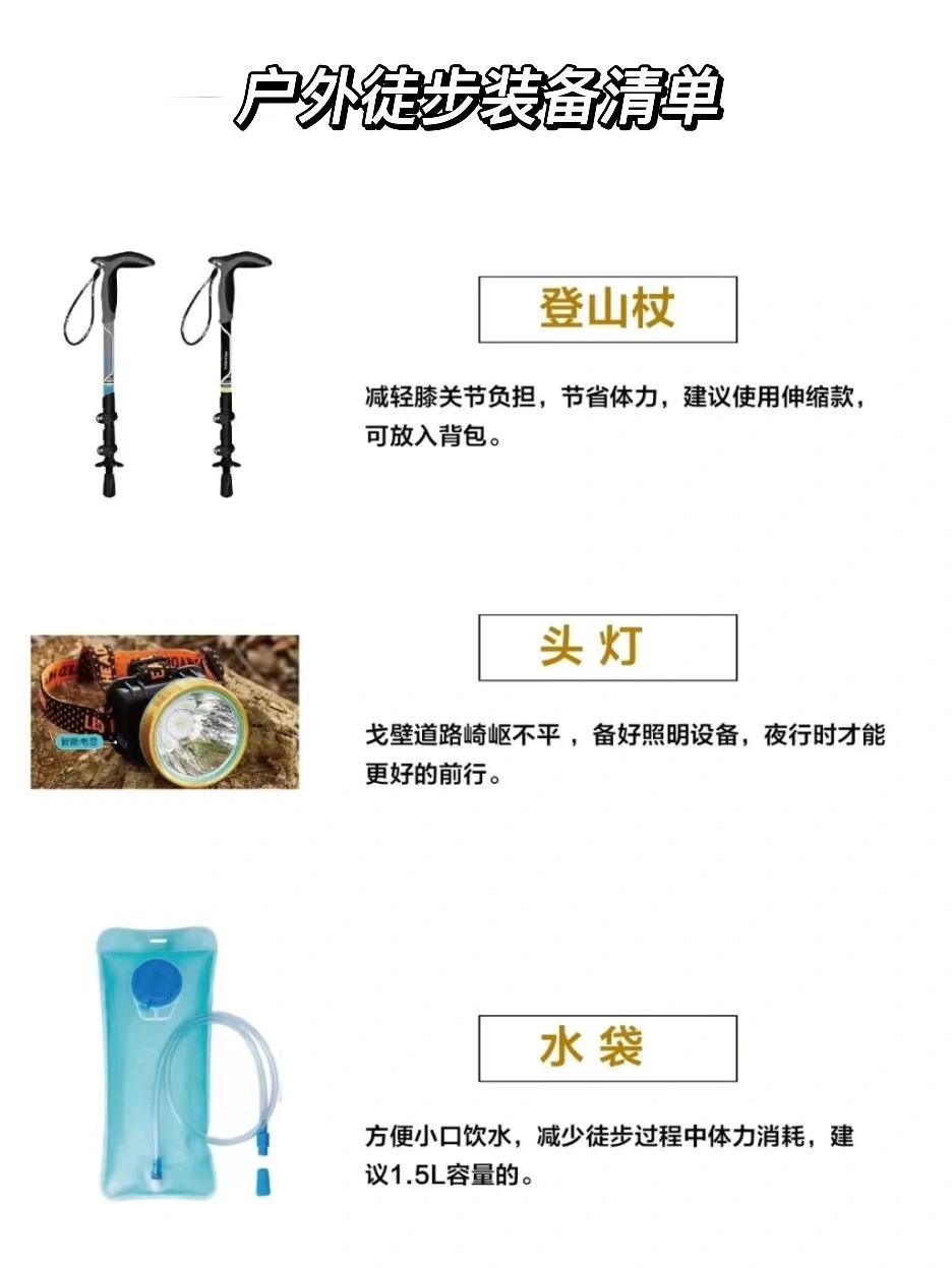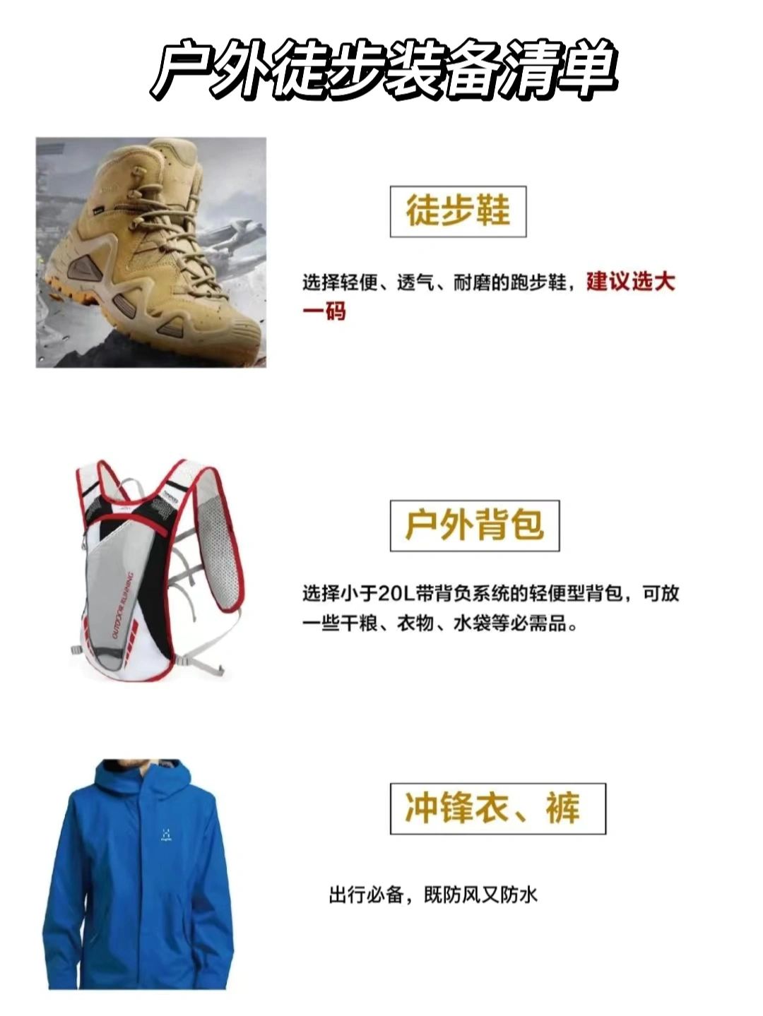 重庆户外新手装备清单来啦关键时刻能救命当大家想走出户外徒步时,第一个问题一定是应该穿什么?带什么?如今越来越多宝子们爱上户外徒步,今天就给大家分享一下新手不踩雷的、从头到脚攻略齐全的徒步装备收藏起来,关键时刻方便查找。服装建议:以防水、保暖、透气、活动方便为主冲锋衣:必备衣物!既防水也防风速干衣裤:透气、速干抓绒、羽绒衣物:保暖徒步鞋:防滑、耐磨、减震、舒适。三层穿衣法:基础层排出汗水隔离层捕捉热量与隔绝冷空气外层阻挡风雪注:根据环境灵活搭配。叠BUFF装备:徒步包:根据行程长短选择背包的容量,轻装上阵是首要登山杖:不仅能够分散身体和背包的重量,保护关节,在上下坡,凹凸路面还能够辅助系保持身体平衡护膝:刚开始爬山的朋友腿部肌肉力量会相对薄弱,护膝可以起到保护膝盖的作用手套:可以保温,也可以在爬山时抓一些辅助物用来借力,防止划伤头巾、帽子:可以保护头部碰撞受伤,也防止身体热量流失。其他类雨衣、护膝、头灯、润唇膏、防晒霜、驱蚊水、保温杯、纸巾、湿纸巾、充电宝、垃圾袋、随身药品、零食补给。。以上不做品牌推荐,大家根据自己实际能力需求选择即可最后给出一些小tips:新手买装备不要想“一步到位”不买极限条件下使用的高配装备同类装备,绝不买最便宜的。身体和灵魂,总要有一个在路上。