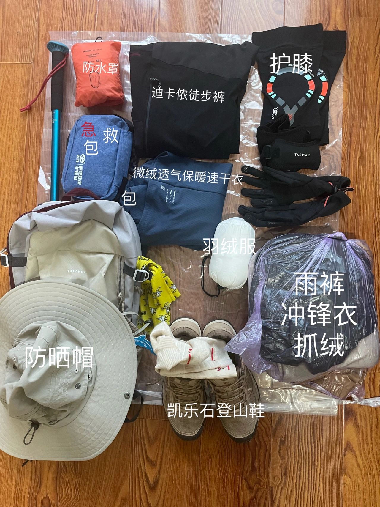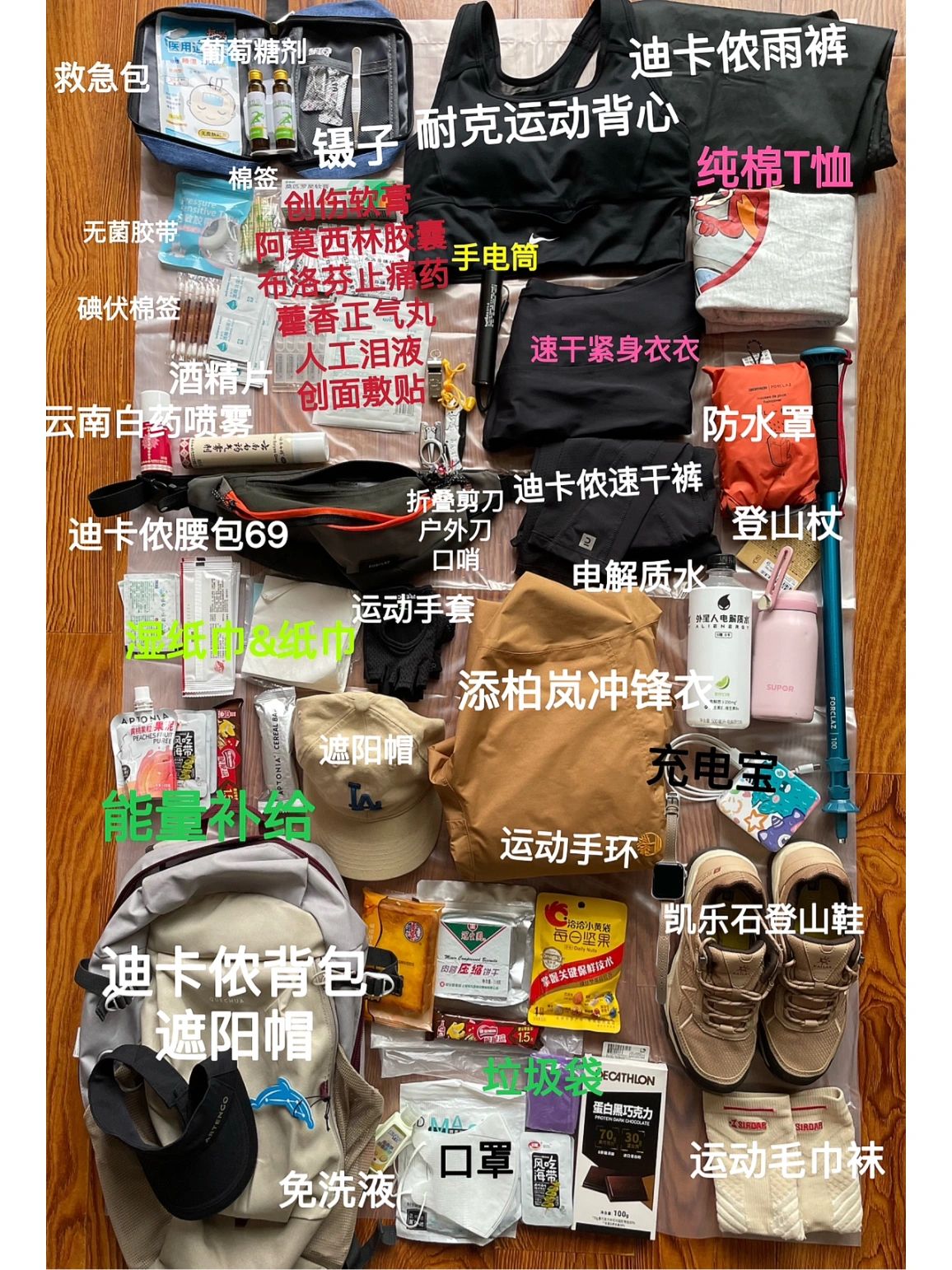 每周一山全网最全,徒步装备清单终于整理出来了下面将会给大家展开说说,服装上:帽子,运动背心、速干衣裤、瑜伽裤、徒步裤、冲锋衣、抓绒衣、高于脚踝的袜子,手套,护膝髌骨带,登山鞋,凯乐石的登山鞋,至少目前来说我非常喜欢,能量补给上:水能量型饮料,能量棒、蛋白棒、牛肉干、压缩饼干、垃圾袋请一定一定爱护环境,带走自己的随身垃圾。总之出发前请一定吃够碳水类食物,如果可以建议在开始徒步前先解决生理问题,社牛的朋友可以忽略,工具类:户外天气类APP,路线APP,充电宝、手电筒头灯,可折叠多功能刀、保温杯,FAK急救包:因特别怕受伤,所以下面是每次徒步都必带的东西,里面分为必带和备用!备用放车里。必带:创可贴4张、碘伏棉签6支、葡萄糖1支、布洛芬2颗、阿莫西林胶囊2颗、眼药水2支、百多邦软管、口哨、备用:藿香正气丸、云南白药喷雾、退烧贴、创面贴、胶布、回形针以上仅为个人总结经验。