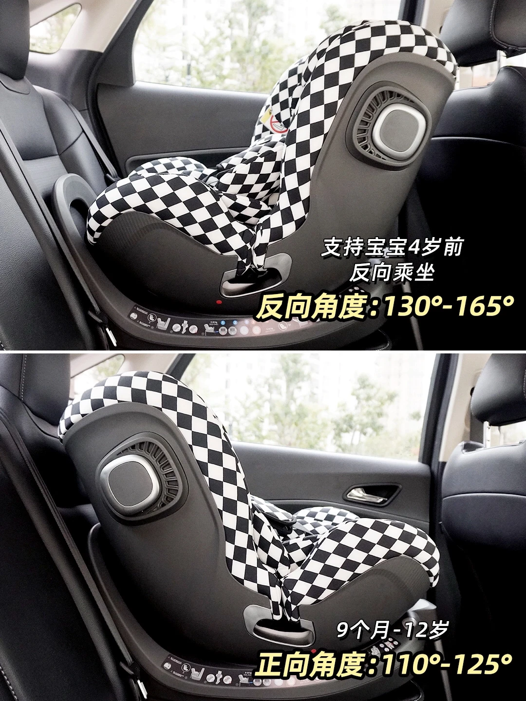 💺结构上是一体注塑,还优选汽车钢做骨架,增加了耐用性。反向安装能到4岁,最大躺角165°,宝宝躺着刚好也不会窝脖子,进一步保护小宝宝颈椎免受车冲击带来的伤害。我家是选跟郭晶晶同款黑白棋盘格!真的好看性价比也高‼️