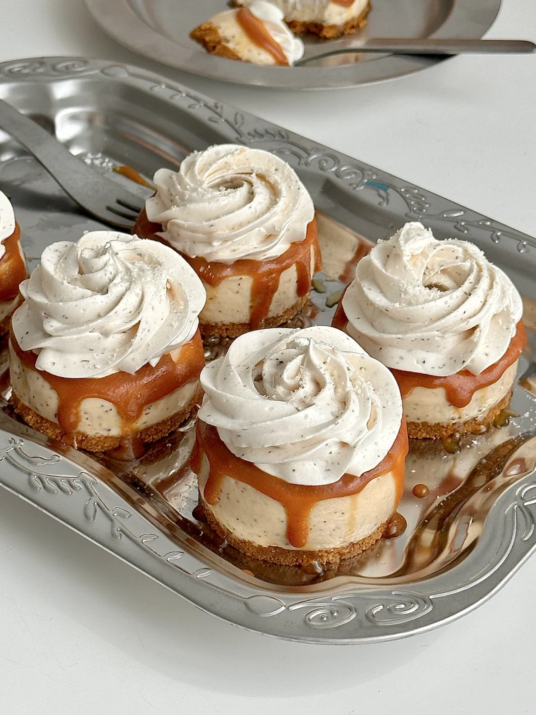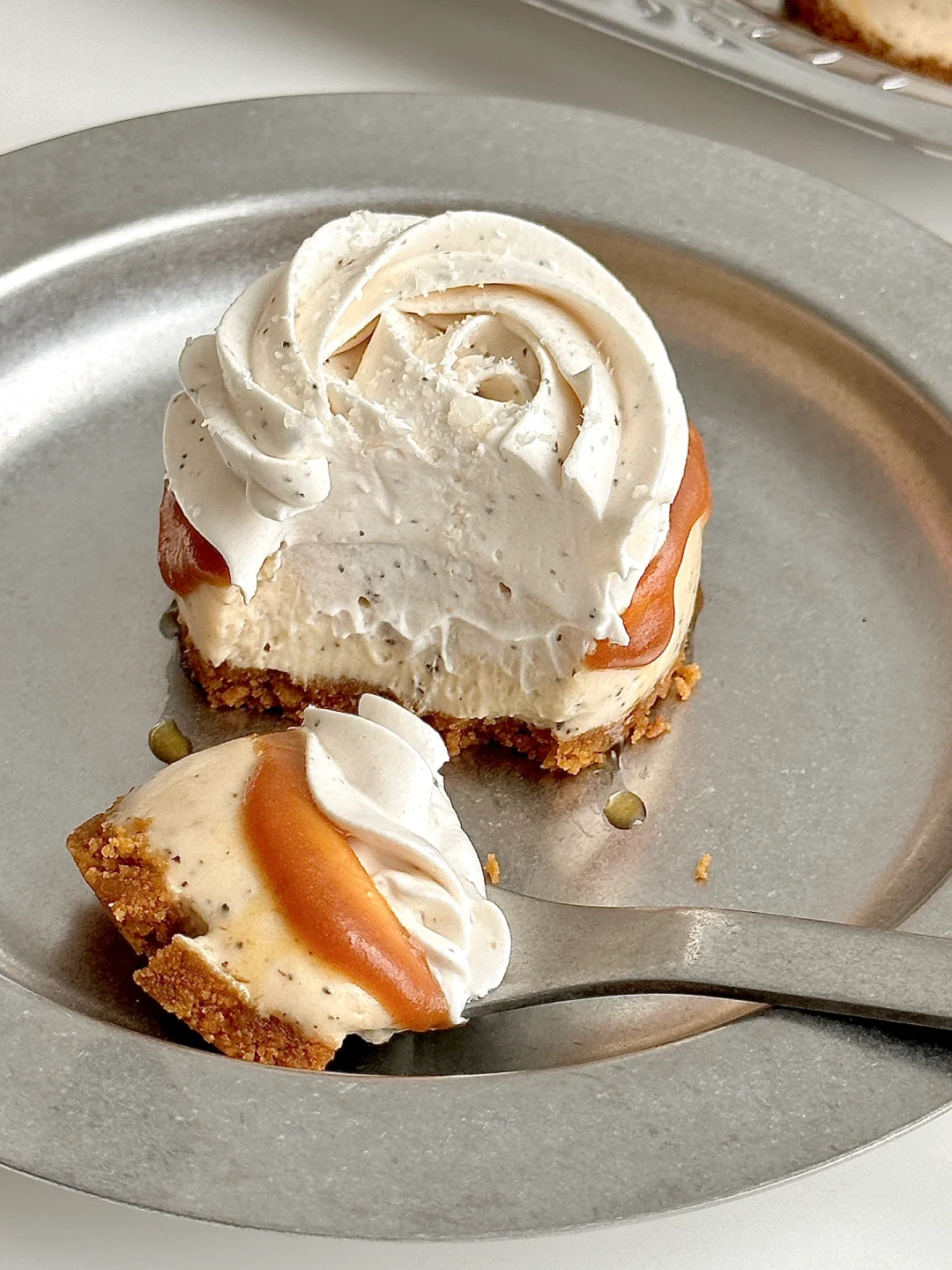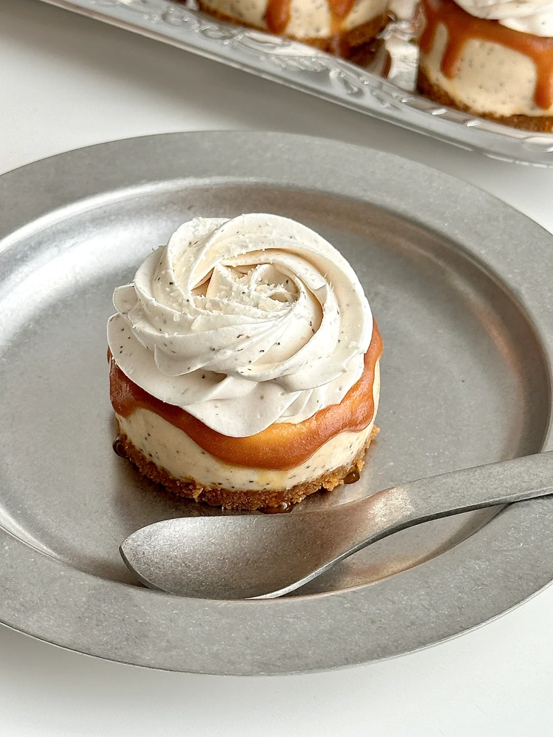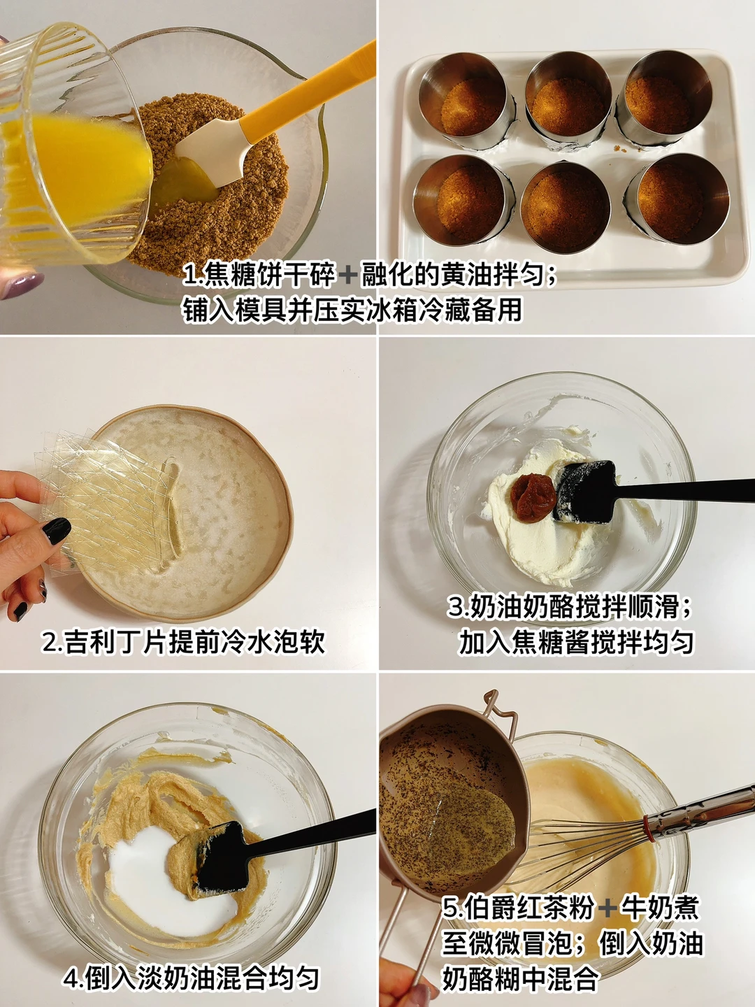 1. 焦糖饼干碎➕融化的黄油拌匀,铺入模具并压实,冰箱冷藏备用