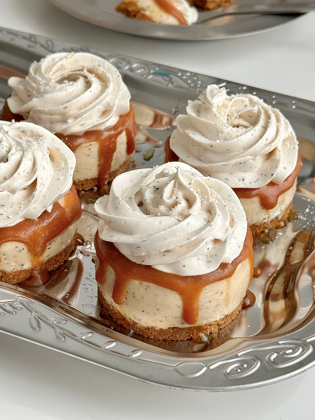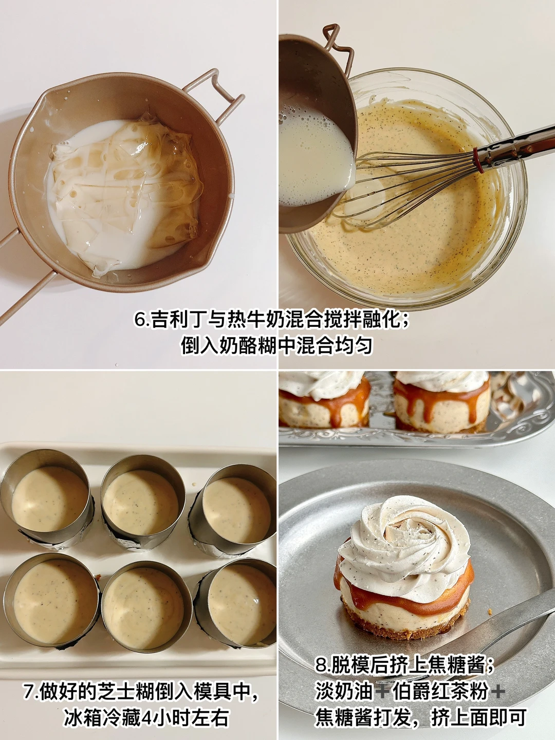 奶油奶酪90g|焦糖酱30g|淡奶油150g|伯爵红茶粉2g➕牛奶30g|吉利丁片5g|热牛奶25g