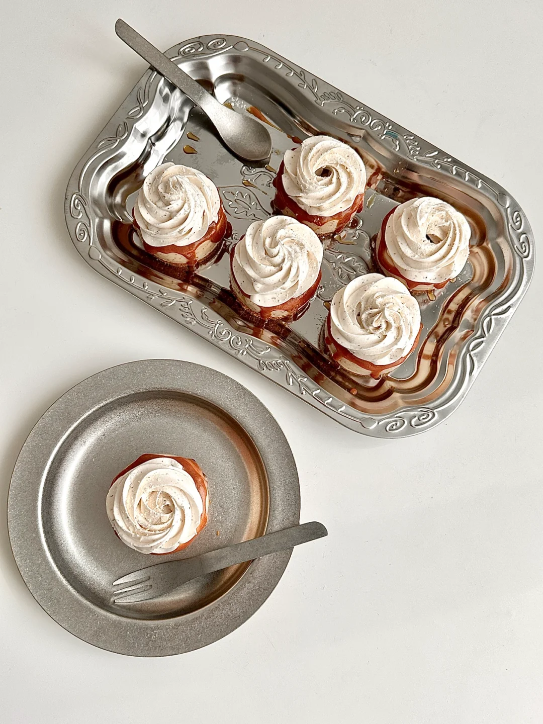6. 脱模后挤焦糖酱,再将奶油花食材混合打发,挤在蛋糕上即可