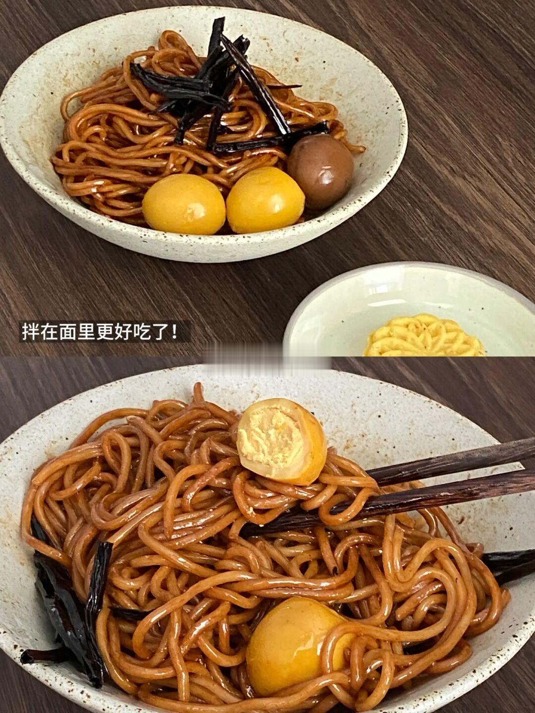 4⃣️煮面后捞出放置碗中备用,将葱段放在最上面,将葱油酱料盛在最上面,拌匀即可开吃