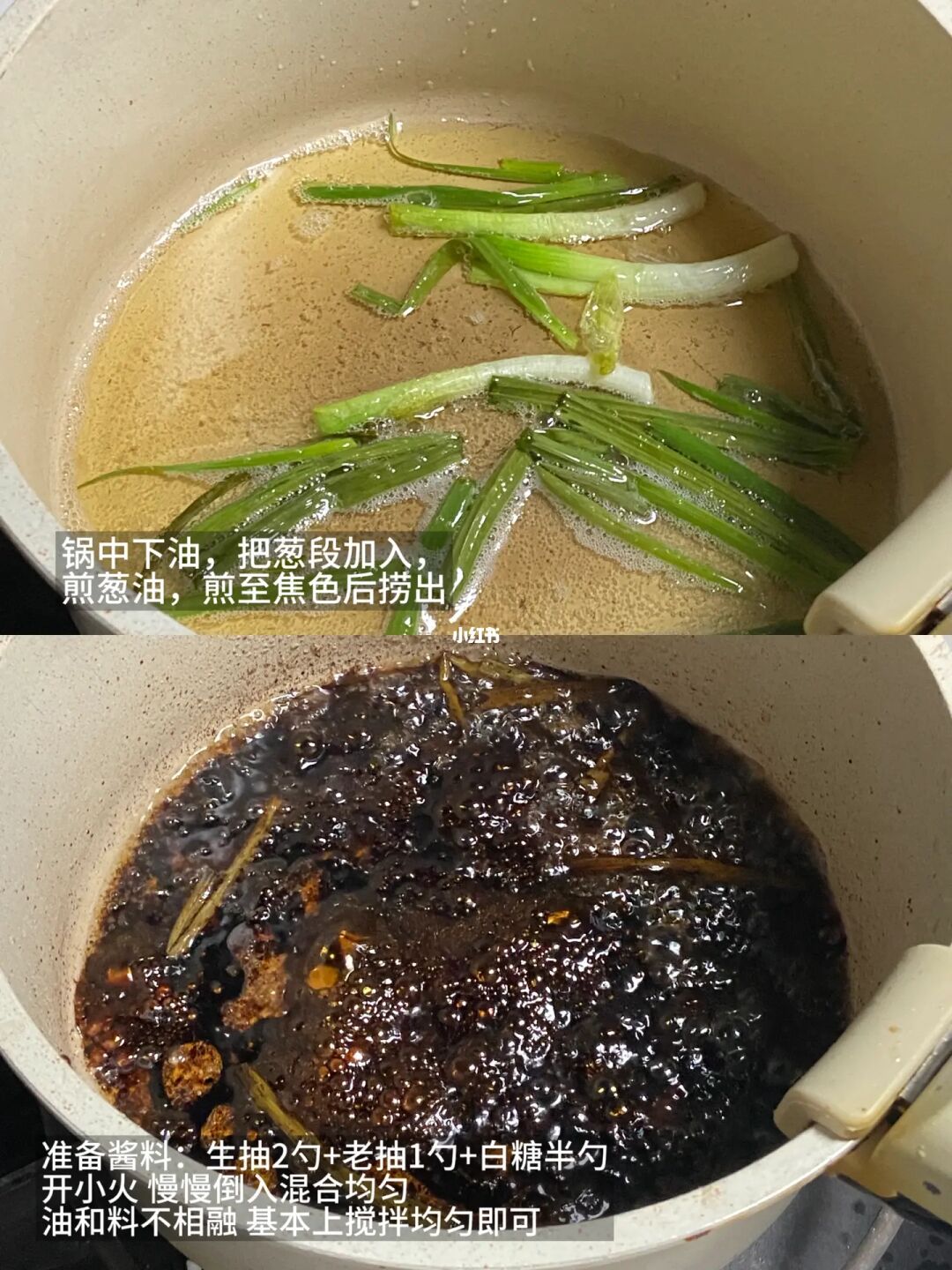 1⃣️锅中下油,把葱段加入,煎葱油,煎至焦色后捞出