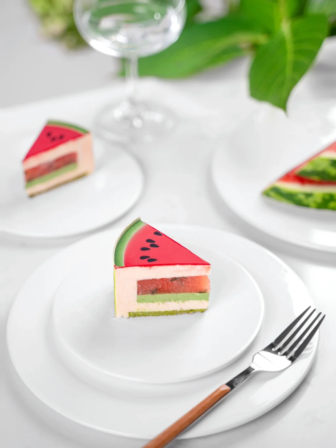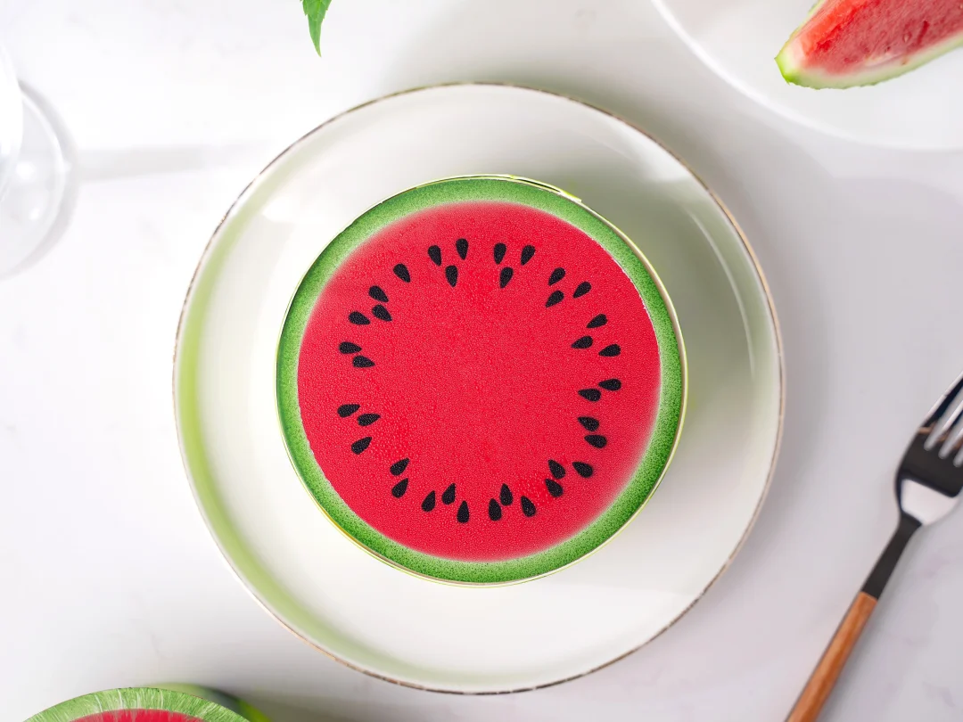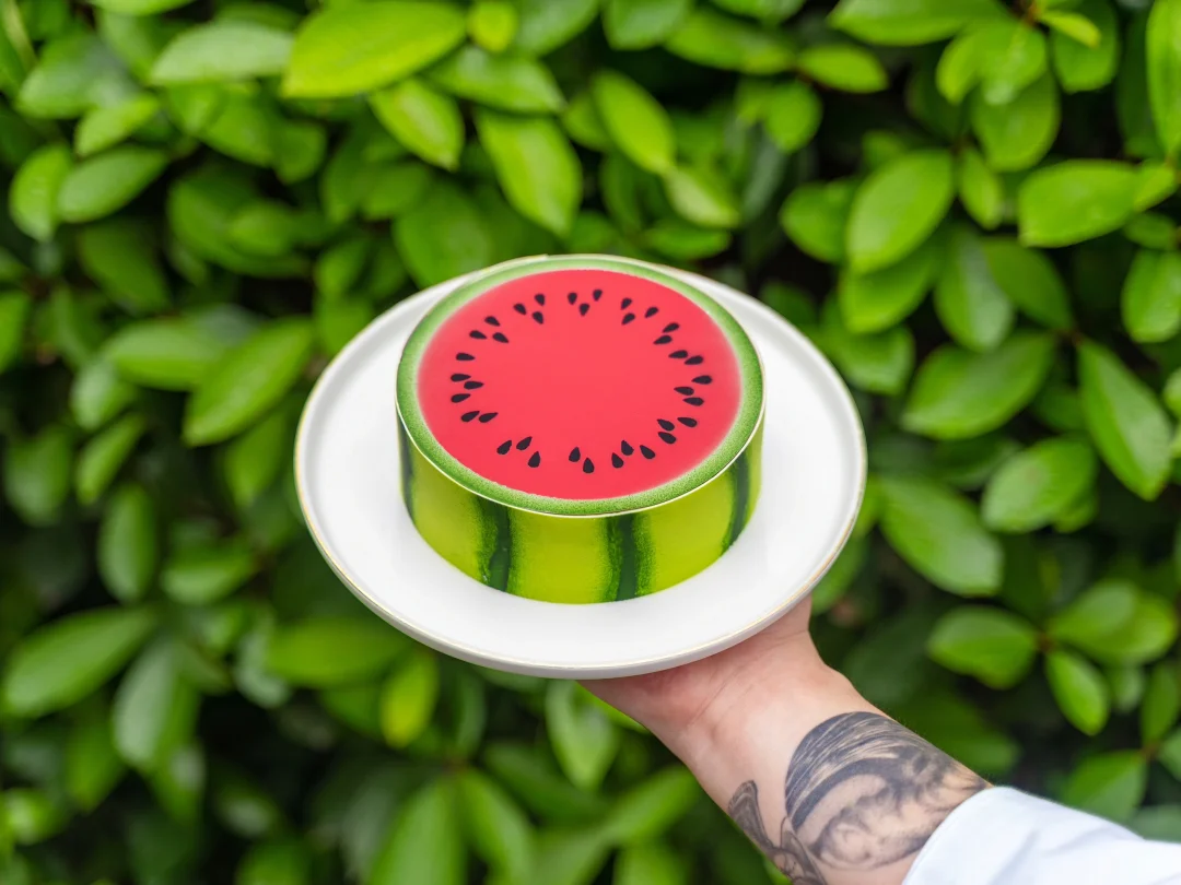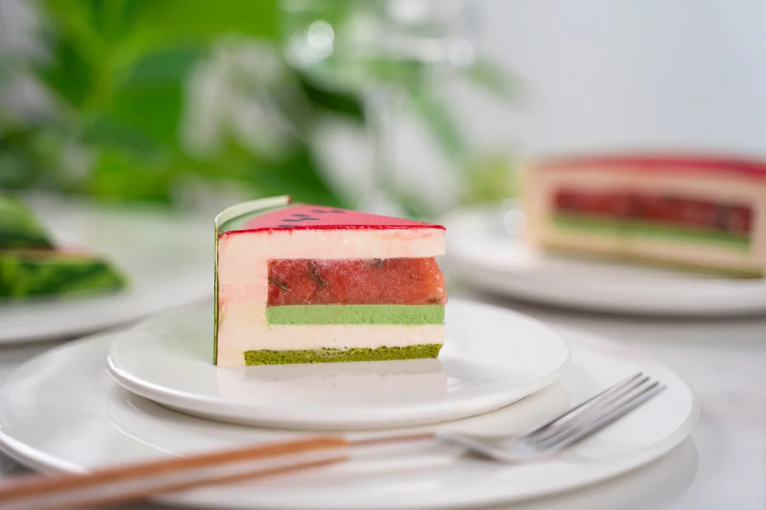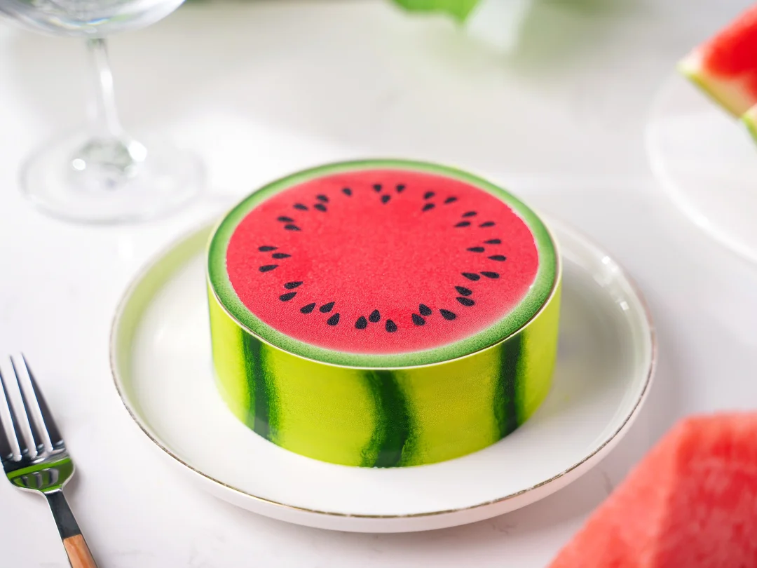 . 🍉今天开始入伏啦,这次三伏天长达40天,热热热🔥,今天分享一款清凉西瓜慕斯~ . 🍉配方配比 1⃣️ 西瓜啫喱 鲜榨西瓜汁400克 新鲜薄荷叶4克 黄原胶4克 西瓜丁150克 吉利丁片4克 . 1、新鲜西瓜汁和黄原胶倒入量杯均质打匀至稠状,加入西瓜丁和新鲜薄荷叶碎搅拌均匀。 2、加入融化的吉利丁片拌匀,注入3连圆柱模具至8成满后冷冻冻硬。 . 2⃣️ 抹茶奶油 淡奶油A100克 细砂糖24克 抹茶粉5克 吉利丁片4克 淡奶油B125克 . 1、淡奶油A、砂糖和抹茶粉搅拌加热至40°C离火过筛,加入融化的吉利丁片拌匀。 2、淡奶油B打发至6成,与抹茶奶液翻拌均匀。 3、注入3连圆柱模具2-3成满震匀,放入脱模的西瓜啫喱后冷冻冻硬。 . 3⃣️ 抹茶蛋糕 蛋清175克 蛋黄90克 低筋粉55克 科麦抹茶粉10克 细砂糖65克 柠檬汁5克 玉米油50克 . 1、抹茶粉、玉米油和牛奶搅拌均匀加热50°C备用。 2、在蛋清中加入柠檬汁,再分3次加入砂糖打发蛋白霜,打发至呈弯钩状。 3、蛋黄打至发白,分次与蛋白霜和过筛的低筋粉翻拌均匀。 4、将面糊与步骤1的抹茶混合物拌匀。 5、抹平至0.5cm厚度,平炉上下火170°C烤制10-12分钟。 . 4⃣️ 西瓜慕斯 奶油奶酪70克 细砂糖25克 鲜榨西瓜汁200克 黄原胶2克 吉利丁片5克 淡奶油100克 柠檬汁4克 . 1、奶油奶酪微波打软后加入砂糖搅拌均匀。 2、新鲜西瓜汁和黄原胶均质打匀至稠状,取130克依次加入奶油奶酪部分和融化的吉利丁搅拌均匀。 3、淡奶油打发至5-6成,与慕斯基液翻拌均匀。 4、加入柠檬汁拌匀。 . 5⃣️ 装饰部分 1、插件由调温好的白巧克力制作,具体操作见视频。尺寸如下: 西瓜瓤巧克力片直径径13cm,围边高度5cm。 2、喷砂液由可可脂调色后使用(深绿色、黄绿色、白色、黑色),操作温度为30°C(也可直接使用成品色油)。 . 6⃣️组装 1、将5寸慕斯圈用保鲜膜封底,内圈围上高5cm的玻璃纸,然后注入慕斯液进行挂壁操作后放入脱模的夹心部分,继续注入一层慕斯液,放入刻印成直径11cm的圆形蛋糕片,抹平多余慕斯液后冷冻冻硬。 2、慕斯脱模后,组装上巧克力插件即可。 .