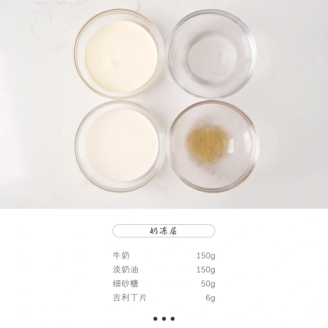 2、奶冻层:淡奶油、砂糖和牛奶加热至60°C离火,加入泡好的吉利丁片融化均匀,隔着冰水降温至室温后使用。