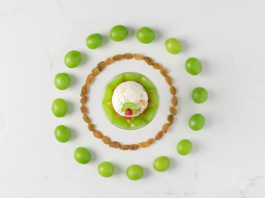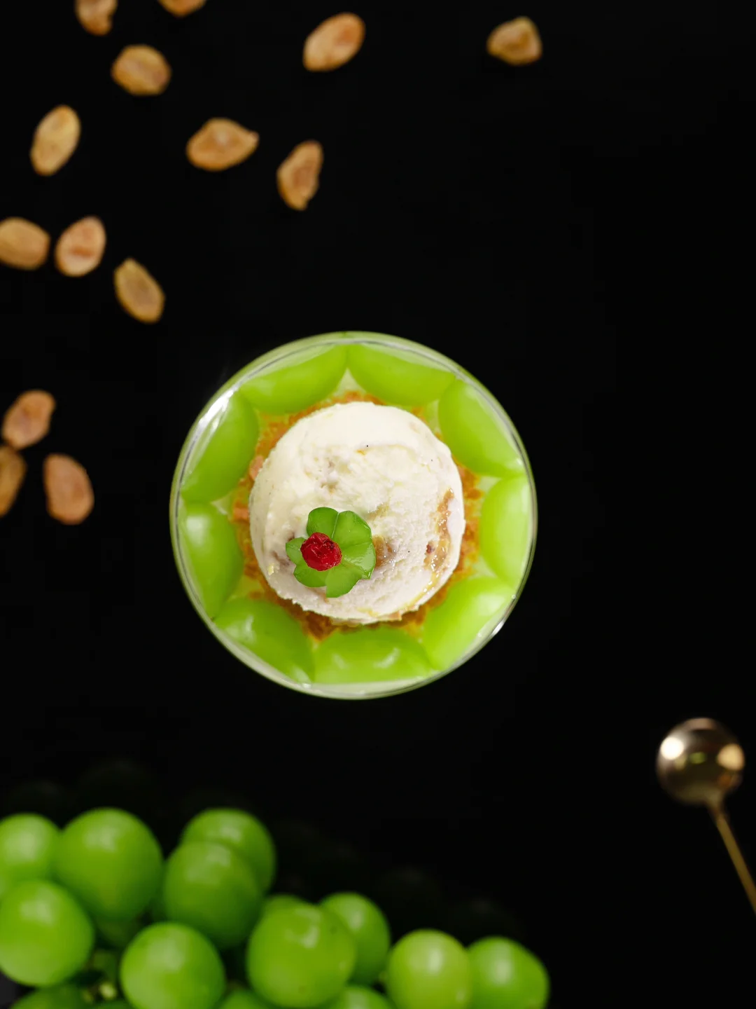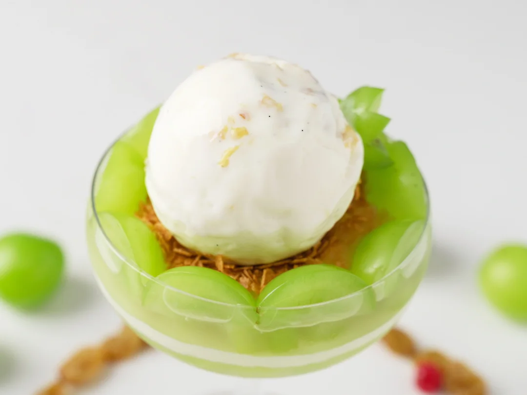 3、贴着杯沿摆上青提(四分之一,切面朝外),中间铺上适量黄油薄脆,摆上冰淇淋球。