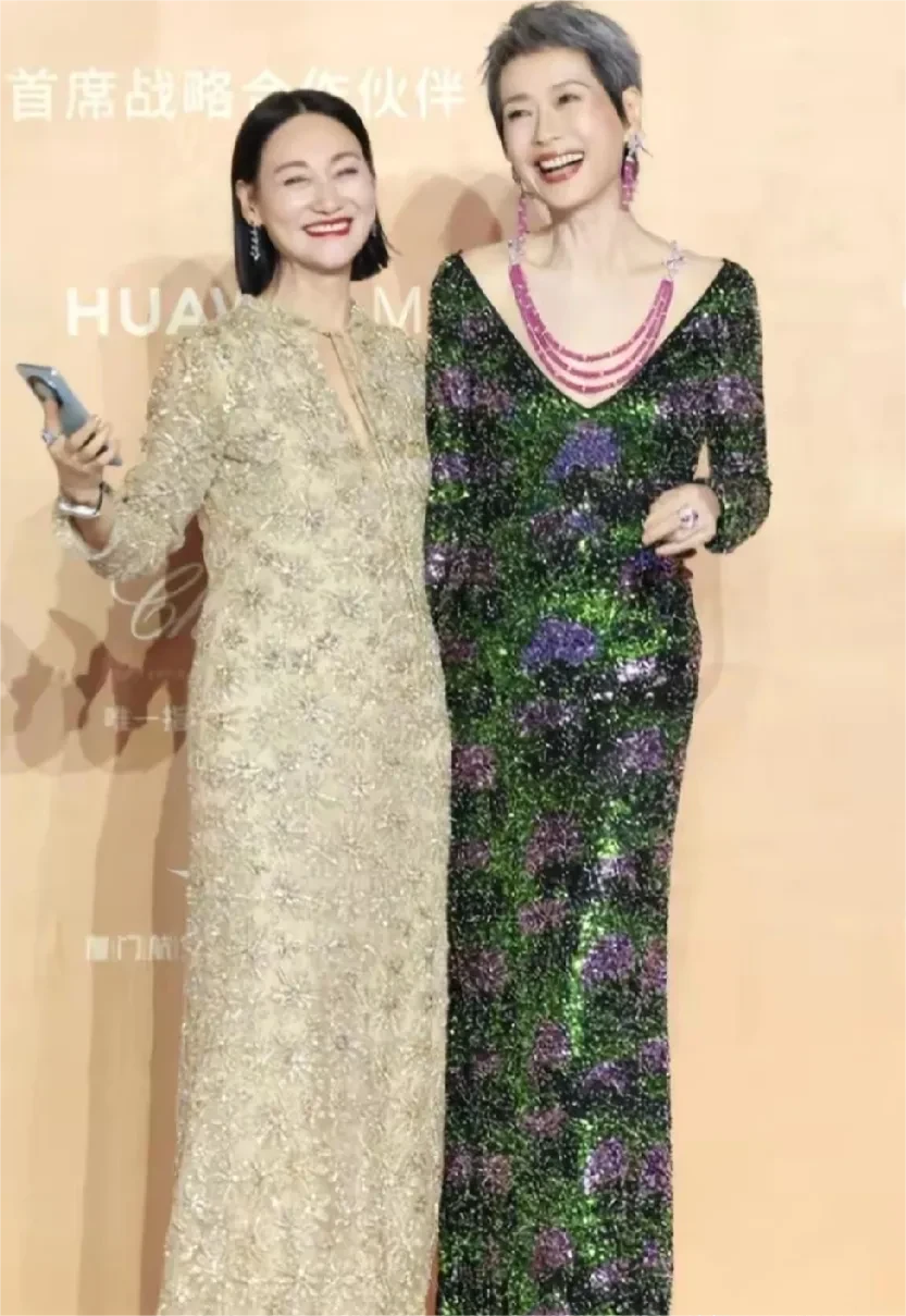 惠英红和叶童两人真的是影后风采啊,穿着亮片花朵礼服的她们好似花丛中最亮眼的两朵花。