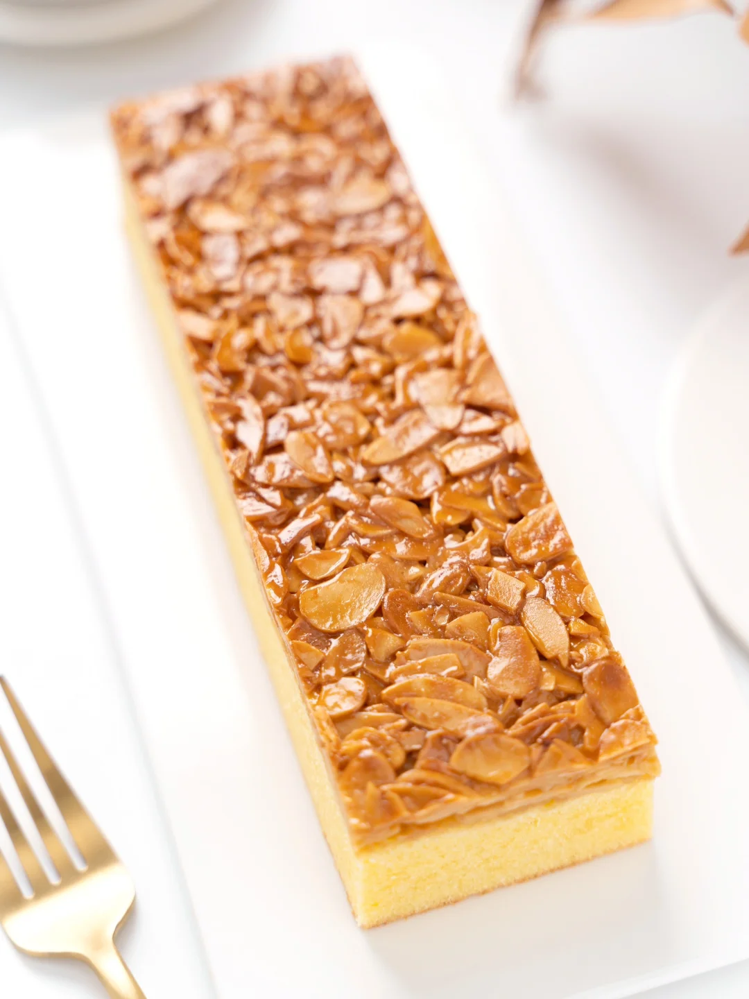 . 🌰今天分享一款常温蛋糕,天气冷了就该吃焦糖[哇R] . 🌰配方看图上 . 🌰制作要点 1⃣️ 杏仁柠檬蛋糕 1、过筛的低筋粉和杏仁粉搅匀。 2、鸡蛋和砂糖隔着热水打发至36-38°C,继续打至发白质地,慢慢加入粉类搅打均匀,分3次加入融化的黄油搅拌均匀顺滑。 3、加入柠檬酒搅拌均匀。 4、倒入油纸封底锡纸包裹的长方形模具中震荡均匀,平炉上下火175°C烤制20分钟。 . 2⃣️ 焦糖蜂蜜杏仁&成品组装 1、淡奶油、蜂蜜、砂糖和黄油混合加热煮至沸腾关火,加入杏仁片搅拌均匀。 2、放到出炉的杏仁柠檬蛋糕上层,用抹刀均匀抹平,放入烤箱平炉上下火175°C再烤制20-25分钟左右,烤制表面变焦糖色后取出。 3、放凉后脱模,切割成合适大小后即可。 .