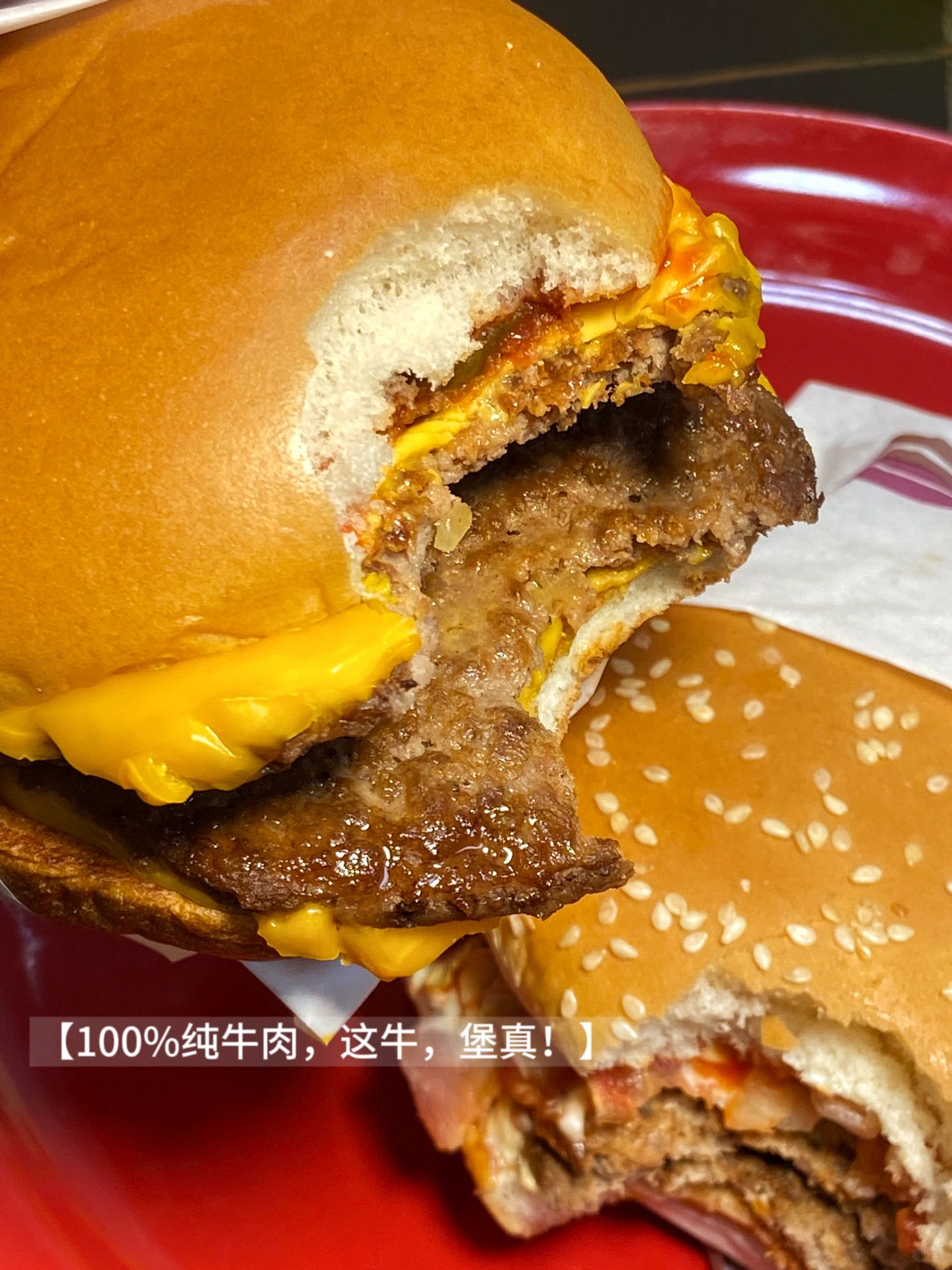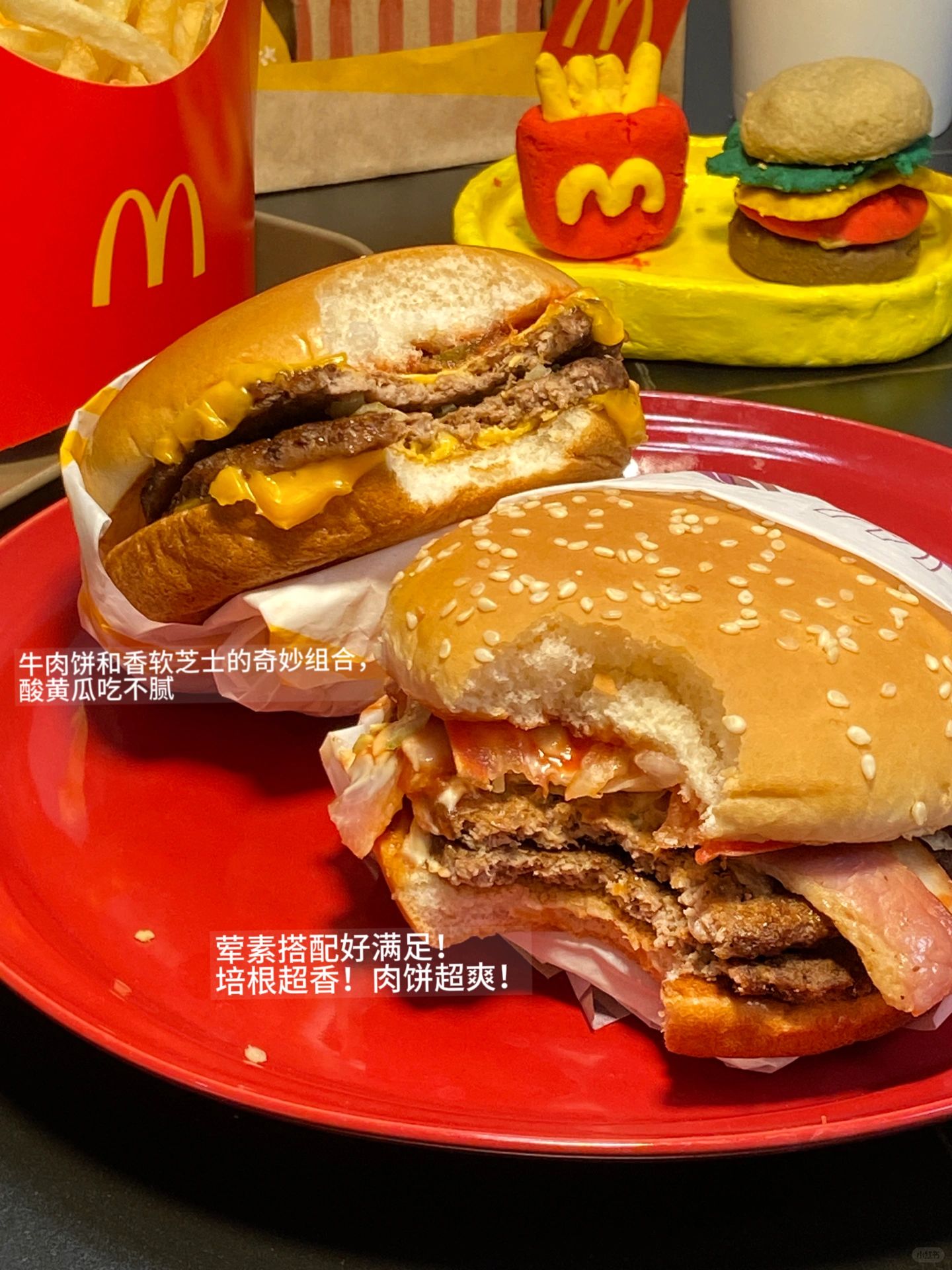 还有我最爱的美味双吉和培根蔬萃双层牛堡!100%纯牛肉放心吃!双吉牛肉饼搭配浓郁芝士片,再来两片酸黄瓜好好吃!培根蔬萃又是另一种口味了,生菜、番茄片爽口清新,还有香香的培根和牛肉饼,快冲啊!一口下去超满足!