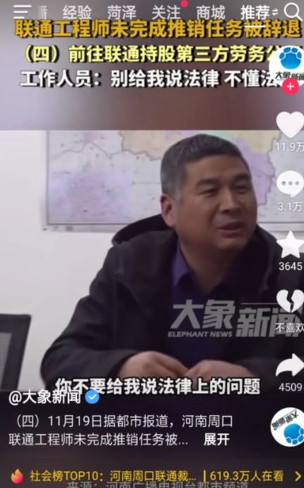 联通公司的回应让人大跌眼镜:“我不懂法,你不要给我说法律的东西”。记者问劳动法规定辞退员工需要提前30天告知并做出一定的赔偿,但是联通公司的人说不懂法去走劳动仲裁吧。