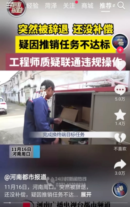 一位在联通公司工作了几十年的维修工程师因良心发现不忍昧着良心换掉客户正常能用的“光猫”路由器,没有完成一个月加钱更换10台路由器的任务被辞退。没有说法没有补偿,还鼓励员工去劳动仲裁。正常的公司都怕劳动仲裁提前按劳动法解决遗留问题,这种迷之操作让人百思不得其解。