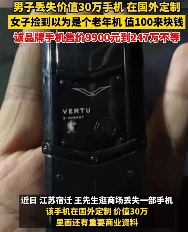 一男子在商场丢了价值30万的VERTU手机,含重要资料,遂报警。民警找到捡手机的女子,手机归还。 女子称本不想贪手机,因其看似不值钱,像百元老年机,故离去。后知其是“手机中的劳斯莱斯”价值几十万,吓了一大跳。 这比手机中的王者8848还高好几个段位,真是贫穷限制了我的想象!