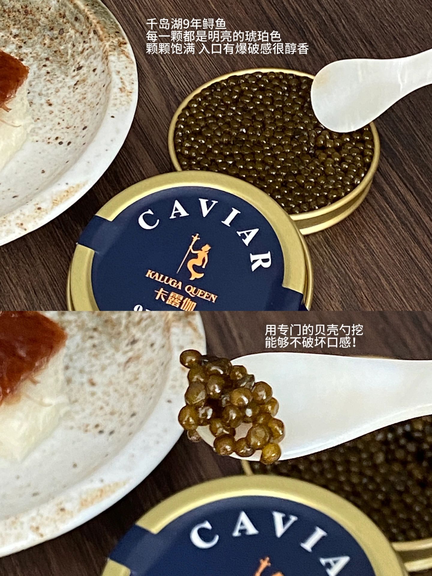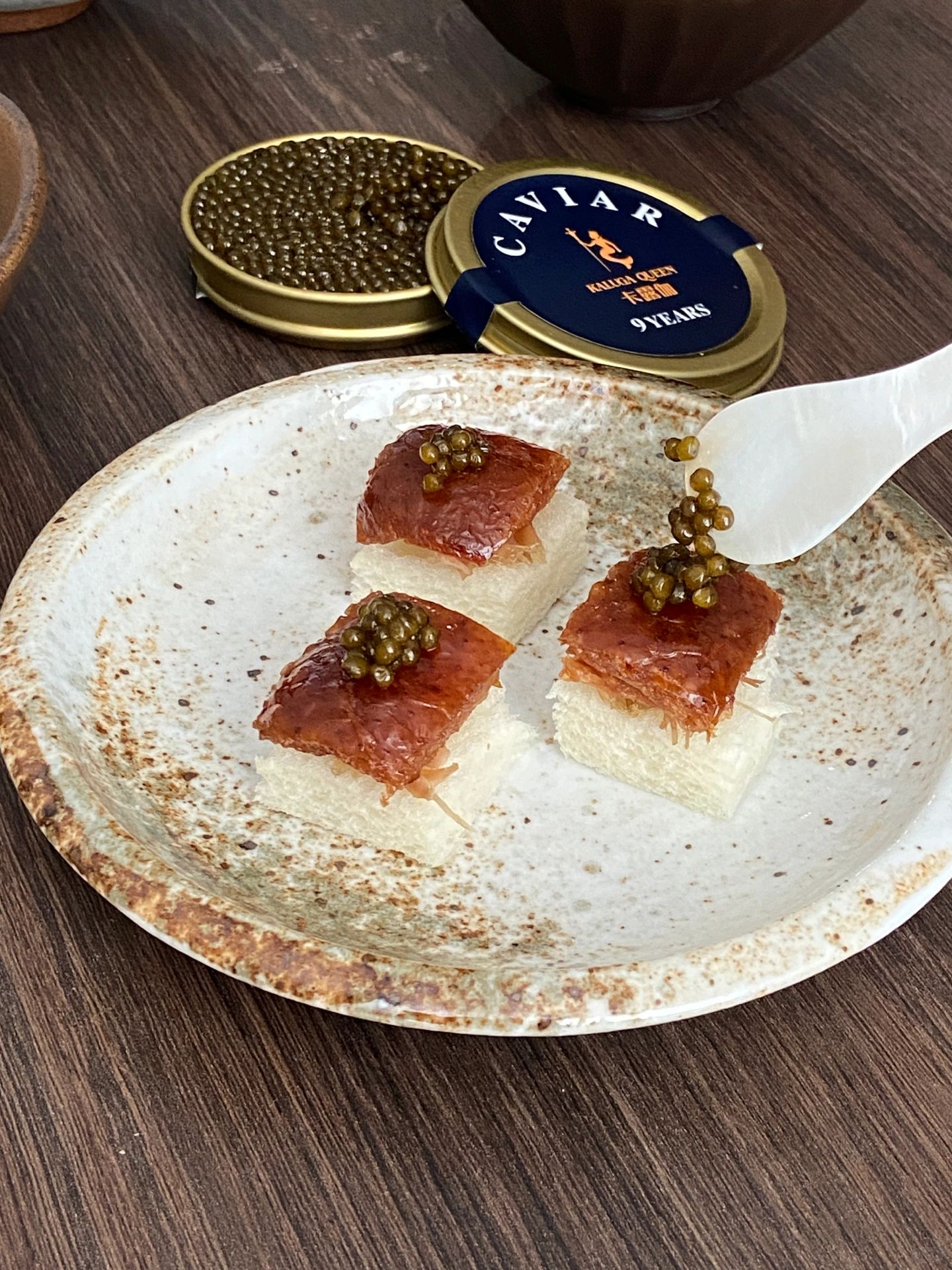 先片一层酥脆的烤鸭皮,切成方块形状,然后再片一点烤鸭肉,两个一起盖在面包片上,最后再铺上灵魂鱼子酱!