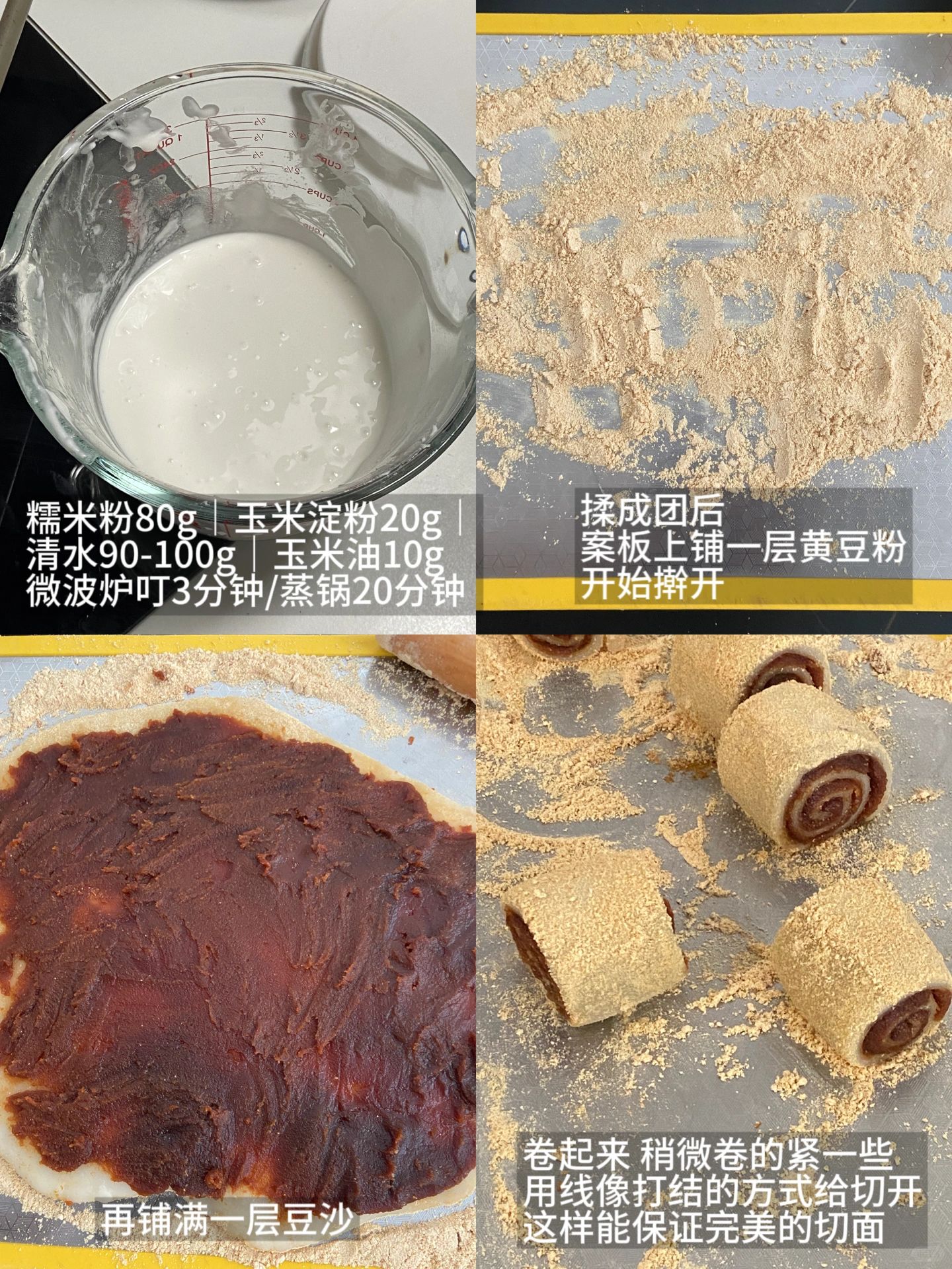 2)案板平铺上一层熟黄豆粉,开始擀平糯米皮,随后表面再铺一层红豆沙,卷好即可