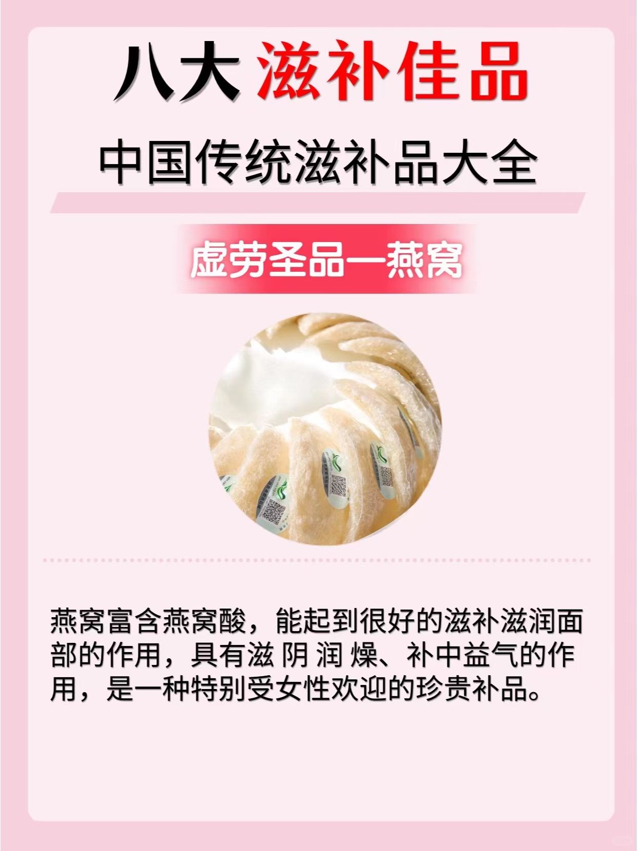 燕窝富含燕窝酸,能起到很好的滋补滋润面部的作用,具有滋 阴 润 燥、补 中 益 气的作用,是一种特别受女性欢迎的珍贵补品。