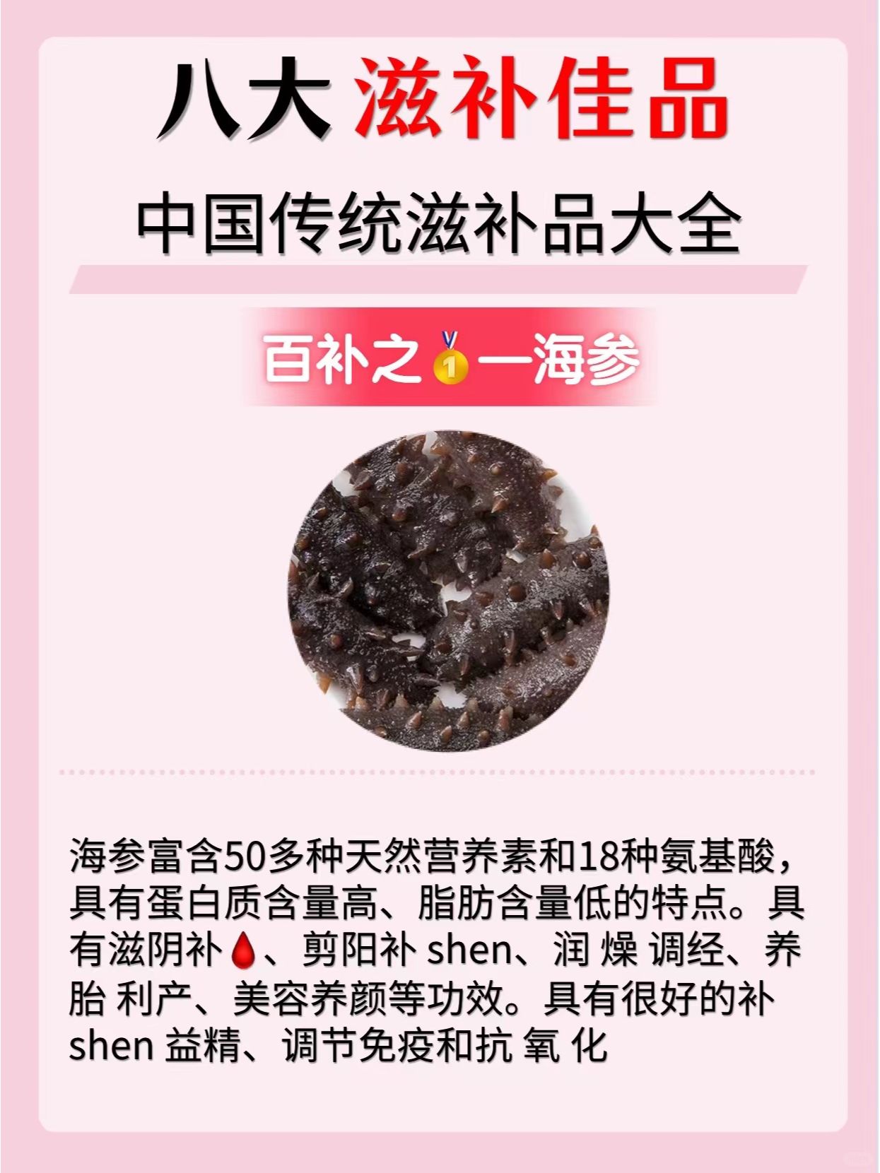 海参富含50多种天 然营养素和18种氨基酸,具有蛋白质含量高、脂肪含量低的特点。具有滋 阴 补 🩸、剪 阳 补 shen、润 燥 调 经、养 胎 利 产、美容养颜等功效。具有很好的补 shen 益 精、调节免Yi 和抗 氧化 作用。