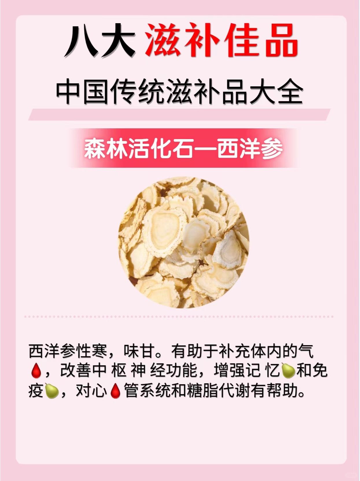 西洋参性寒,味甘。有助于补充体内的气🩸,改 shan 中 枢 神 经功能,增强记忆🍐和免 Yi 🍐,对心🩸管系统和糖脂代谢有帮助。