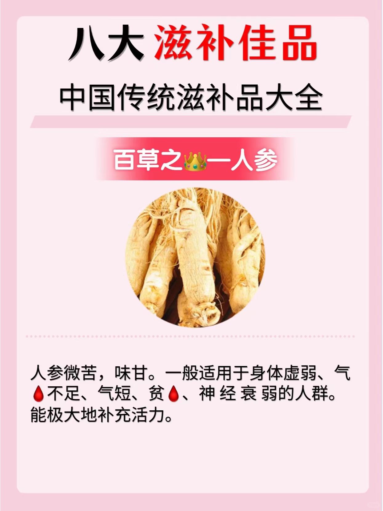 人参微苦,味甘。一般适用于身体虚弱、气🩸不足、气短、贫🩸、神 经 衰 弱的人群。能极大地补充活力。