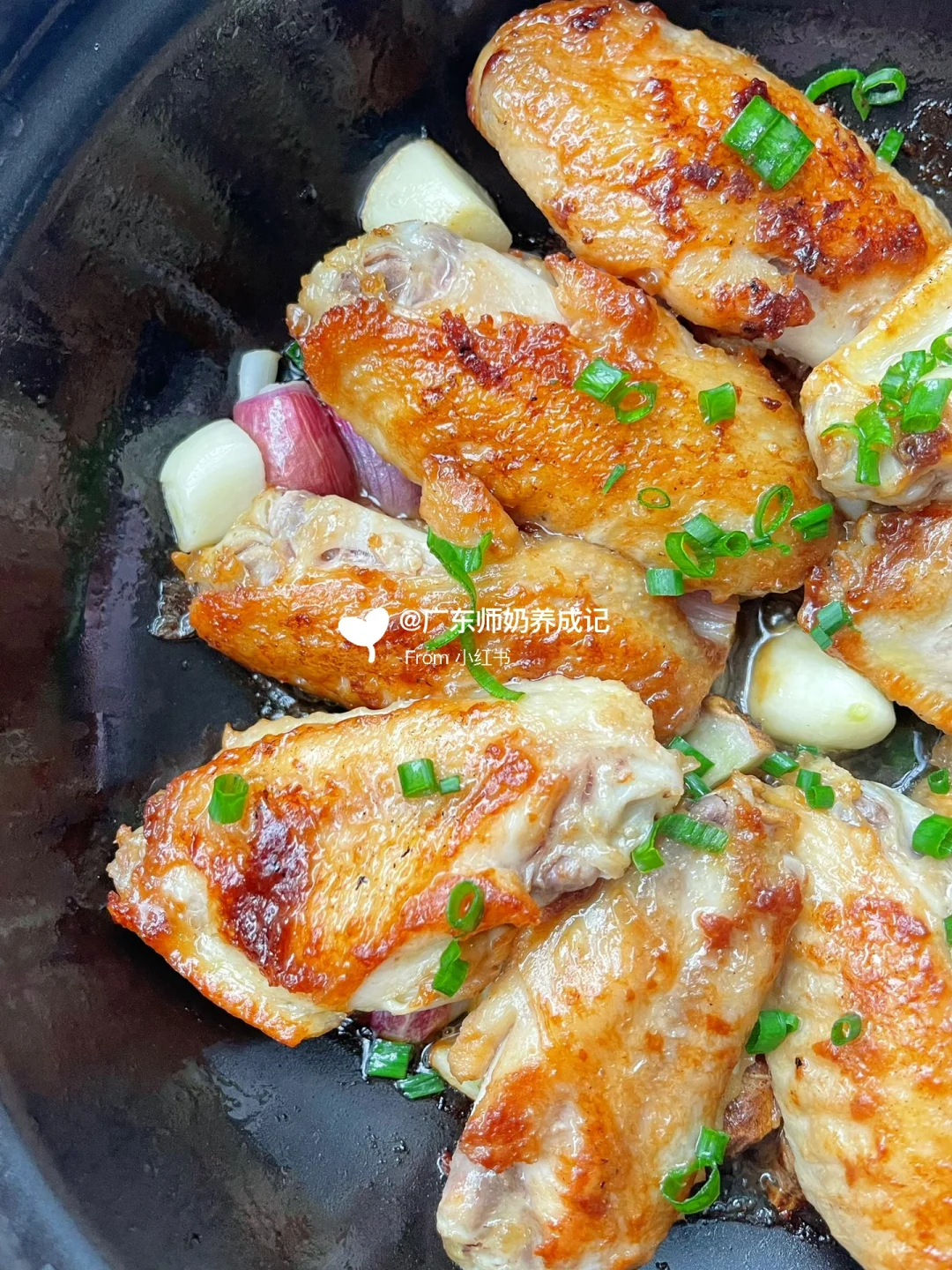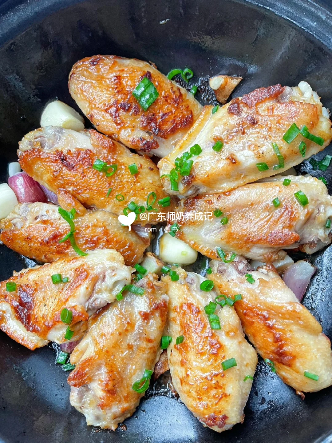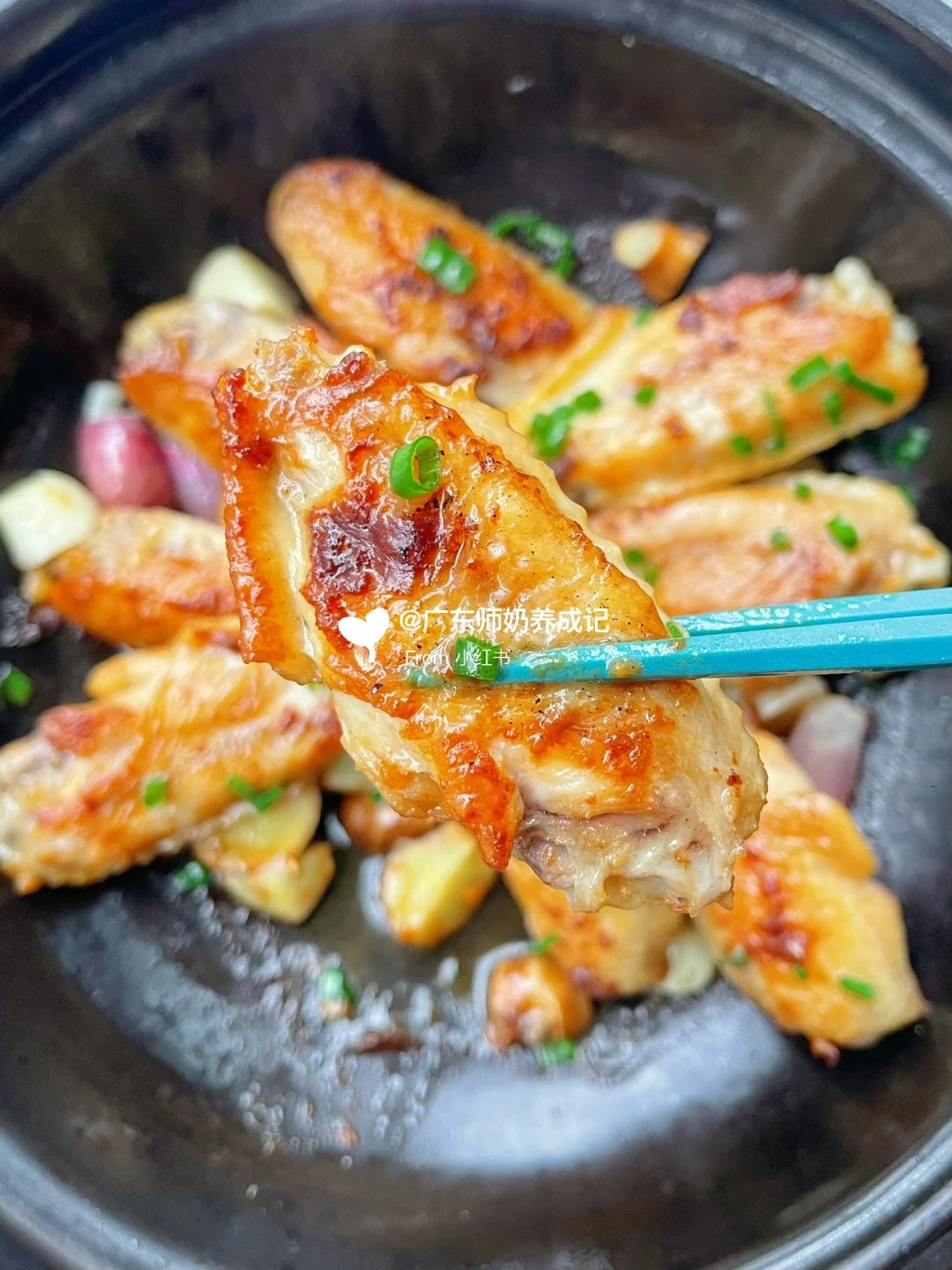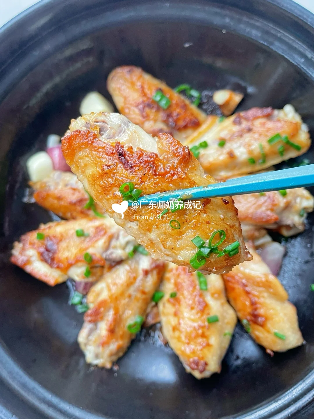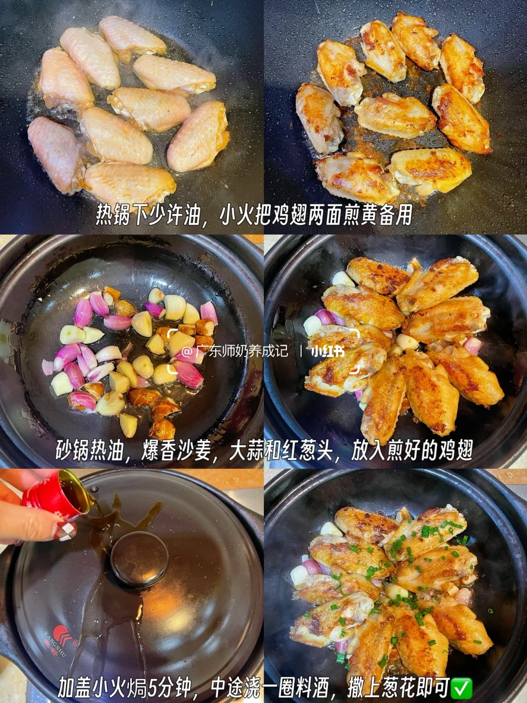 3️⃣另起砂锅热油爆香沙姜,蒜和红葱头,加入鸡翅,加盖浇一圈料酒,小火焗5分钟,撒上迷人的葱花即可✅