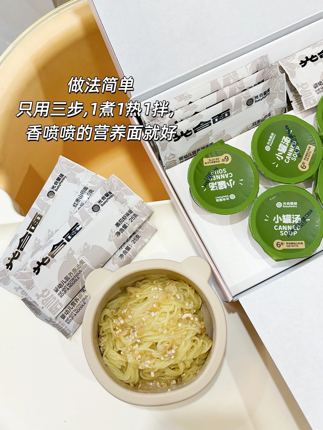 🚩像我在给宝宝买辅食产品的时候,就先看它是否符合婴标,然后在看配料表。像我最近入手的光合星球面为例,配料表干干净净!没有乱七八糟的添加!符合婴标标准!!里面有面有汤,做法简单。只用三步,1煮1热1拌,香喷喷的营养辅食就好了。像我平时比较忙,没有多的时间给宝宝做辅食,也不担心宝宝营养摄入不足!!