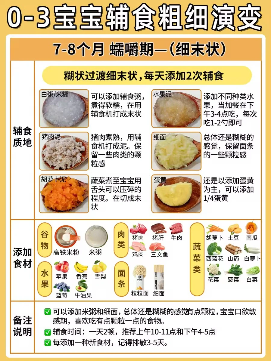 ▫️辅食质地:厚糊状过渡到细末状。宝宝舌头可以上下运动,喜欢食物有颗粒感,锻炼蠕嚼能力