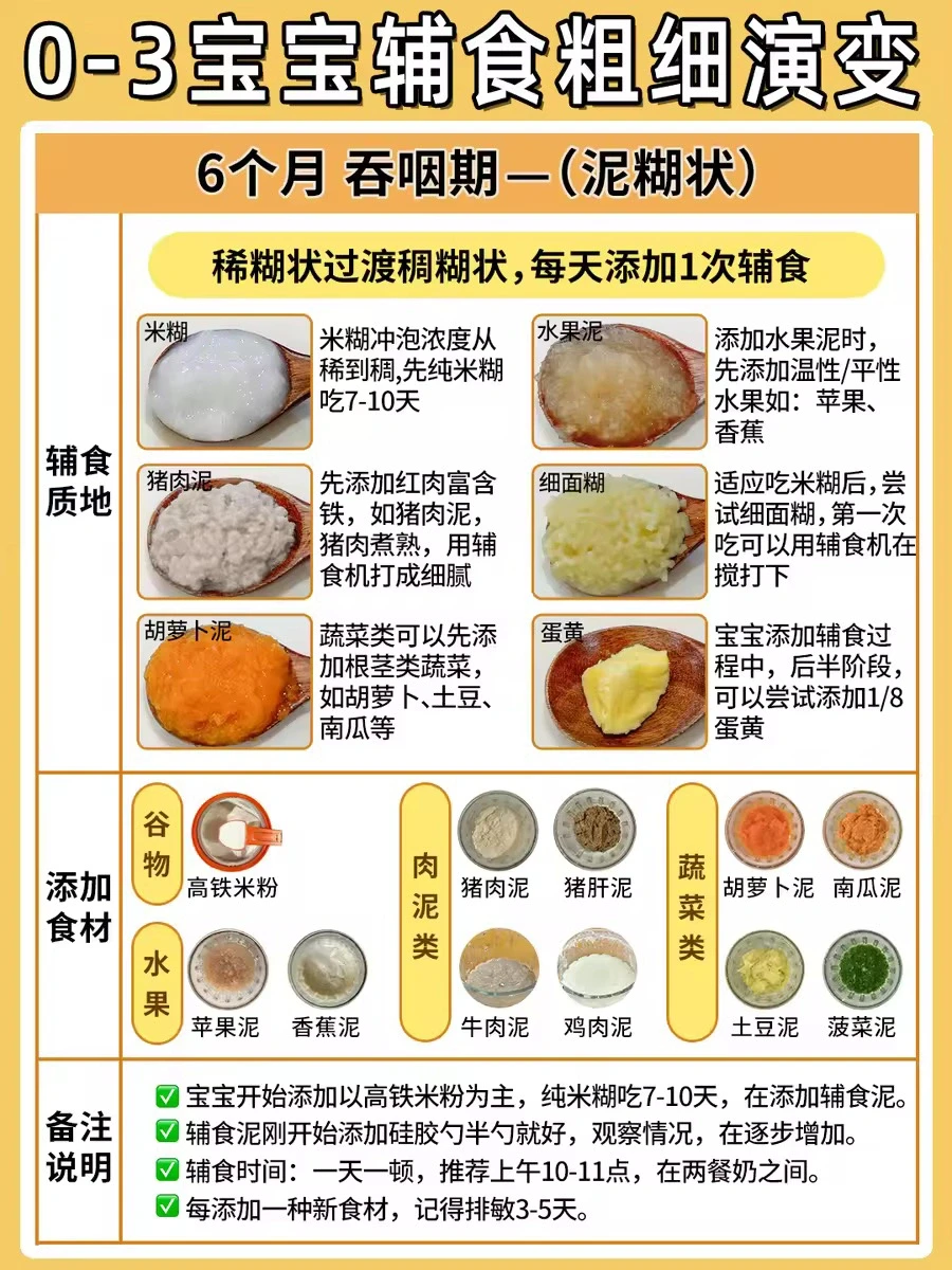 宝宝在6月龄添加辅食后,在不同月份添加的食物粗细是不一样的❓随着宝宝咀嚼吞咽能力 的增加,辅食添加食材性状可分为泥糊状、细末状、小颗粒状、小块状。