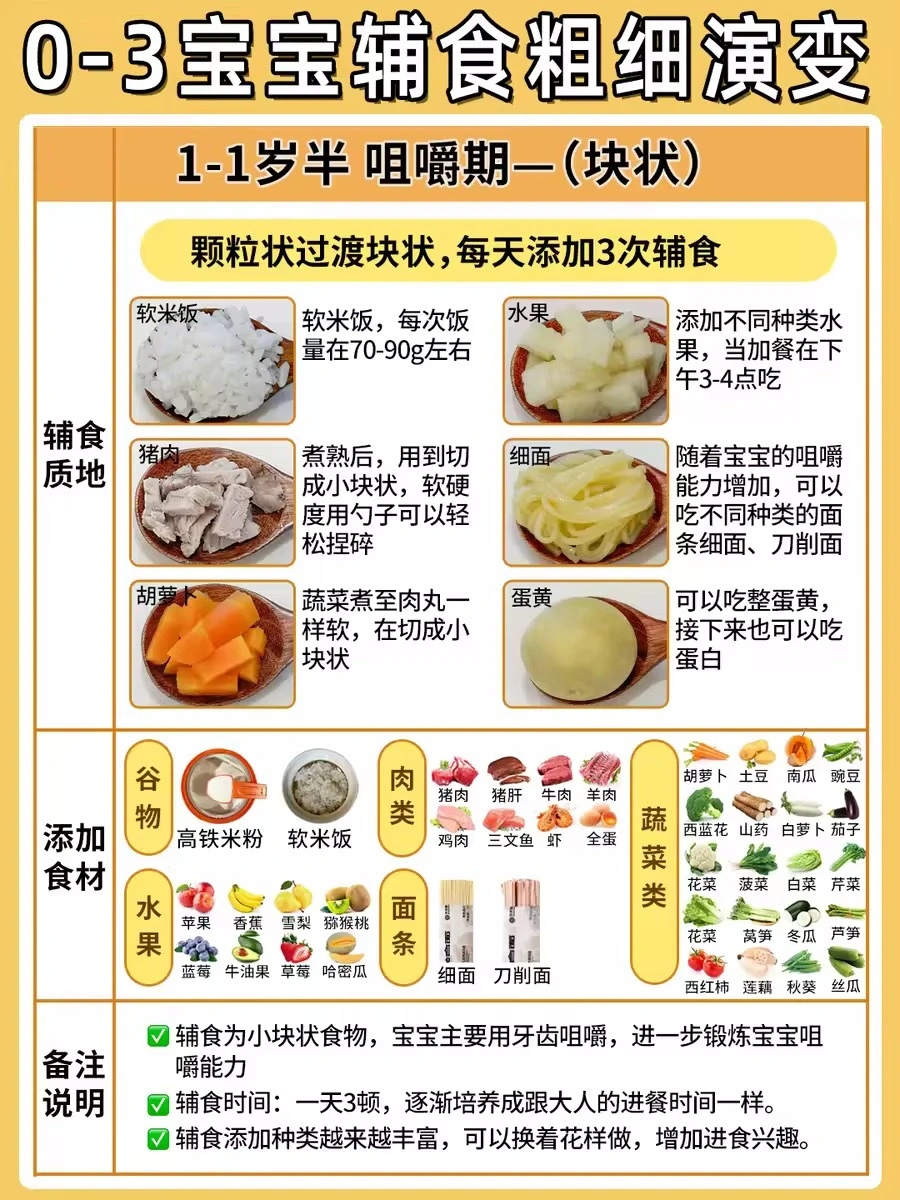 ▫️辅食质地:辅食为小块状,宝宝用牙齿咀嚼,进一步锻炼宝宝咀嚼能力
