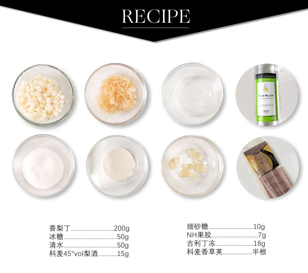 1、香梨丁、清水、冰糖和香草籽搅拌加热煮沸并保持沸腾1分钟,降温至40°C倒入提前拌匀的果胶和砂糖,再次煮沸并保持沸腾1分钟离火。