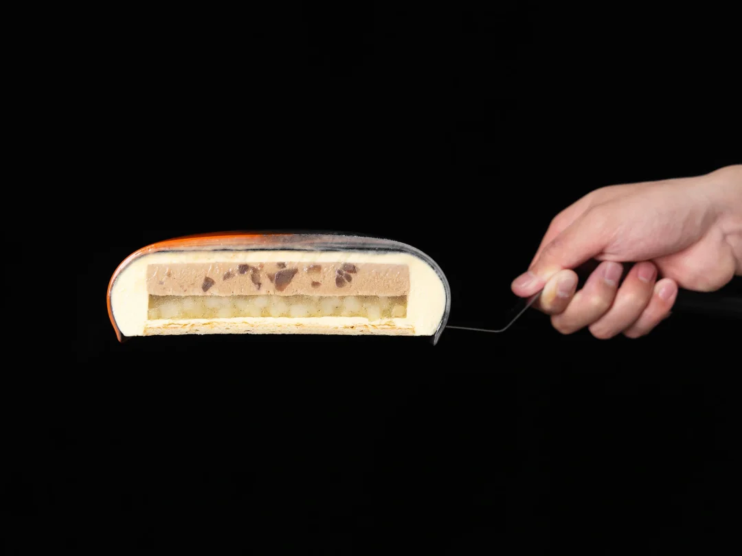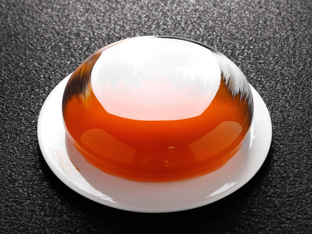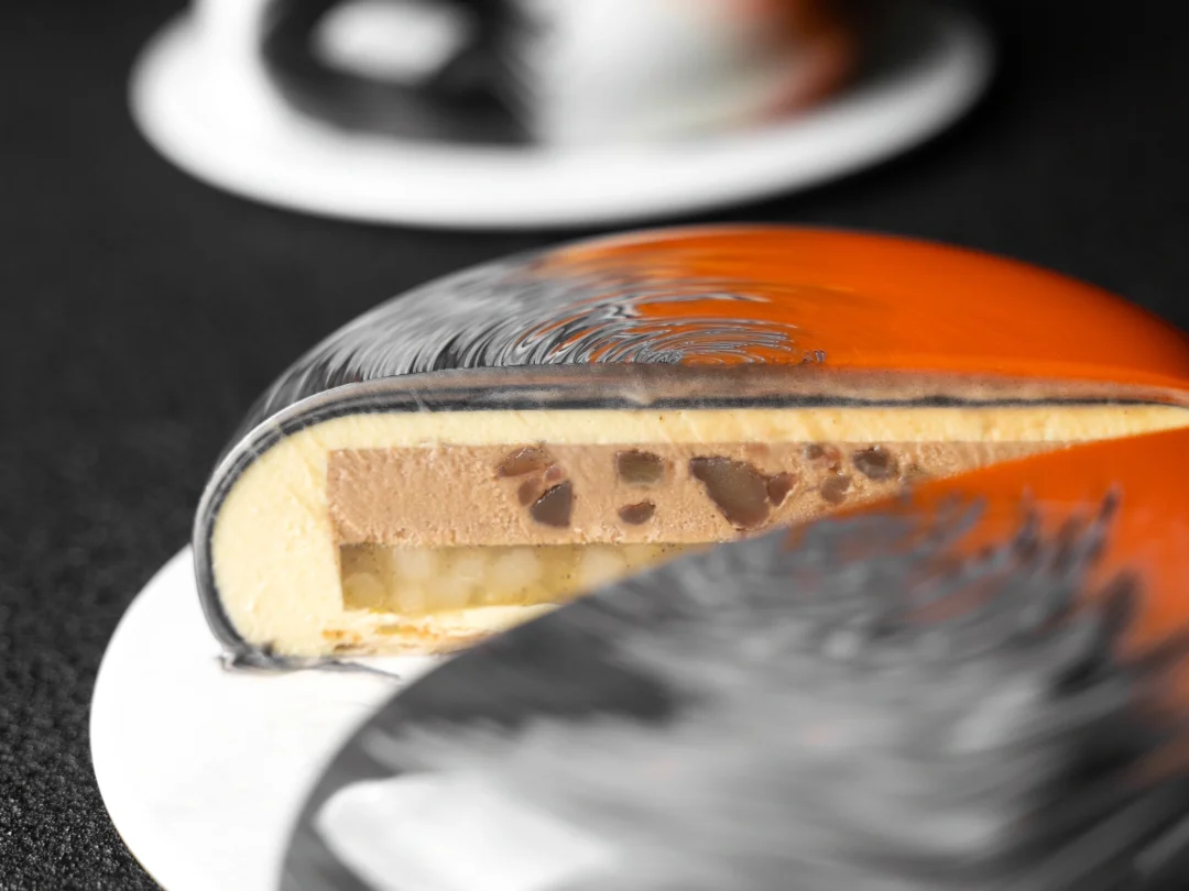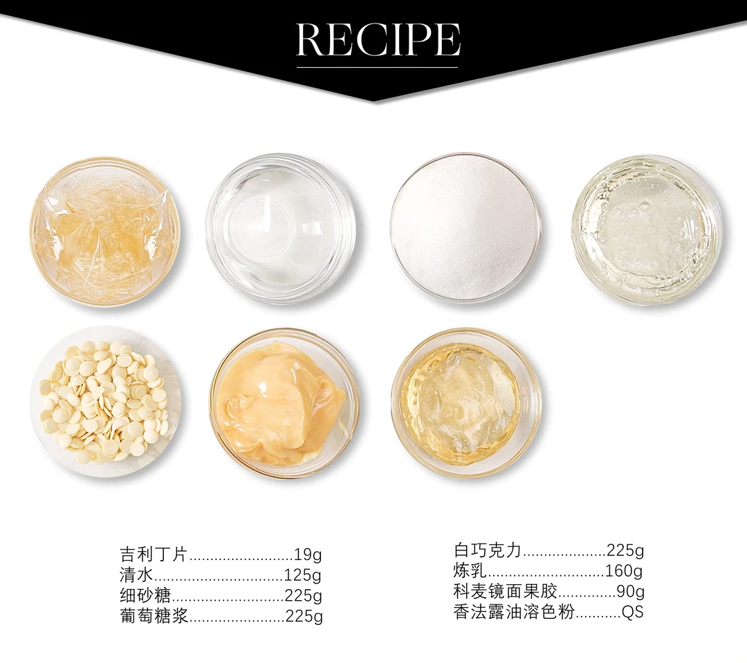 1、清水、砂糖和葡萄糖浆混合加热至103°C离火,冲入到白巧克力、炼乳、吉利丁片和镜面果胶中,用均质机乳化至顺滑质地。