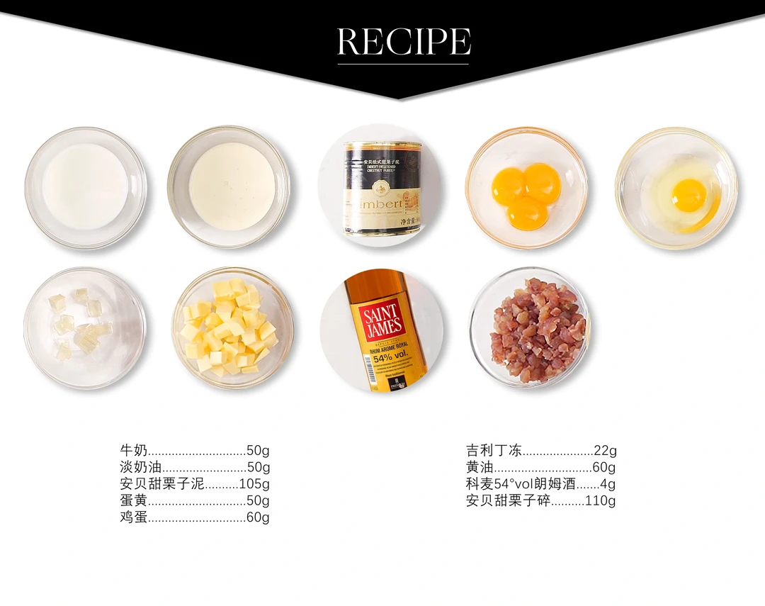 1、甜栗子泥、牛奶、淡奶油、蛋黄和鸡蛋混合用均质机搅打均匀,倒入锅中中小火搅拌加热煮至83°C离火。