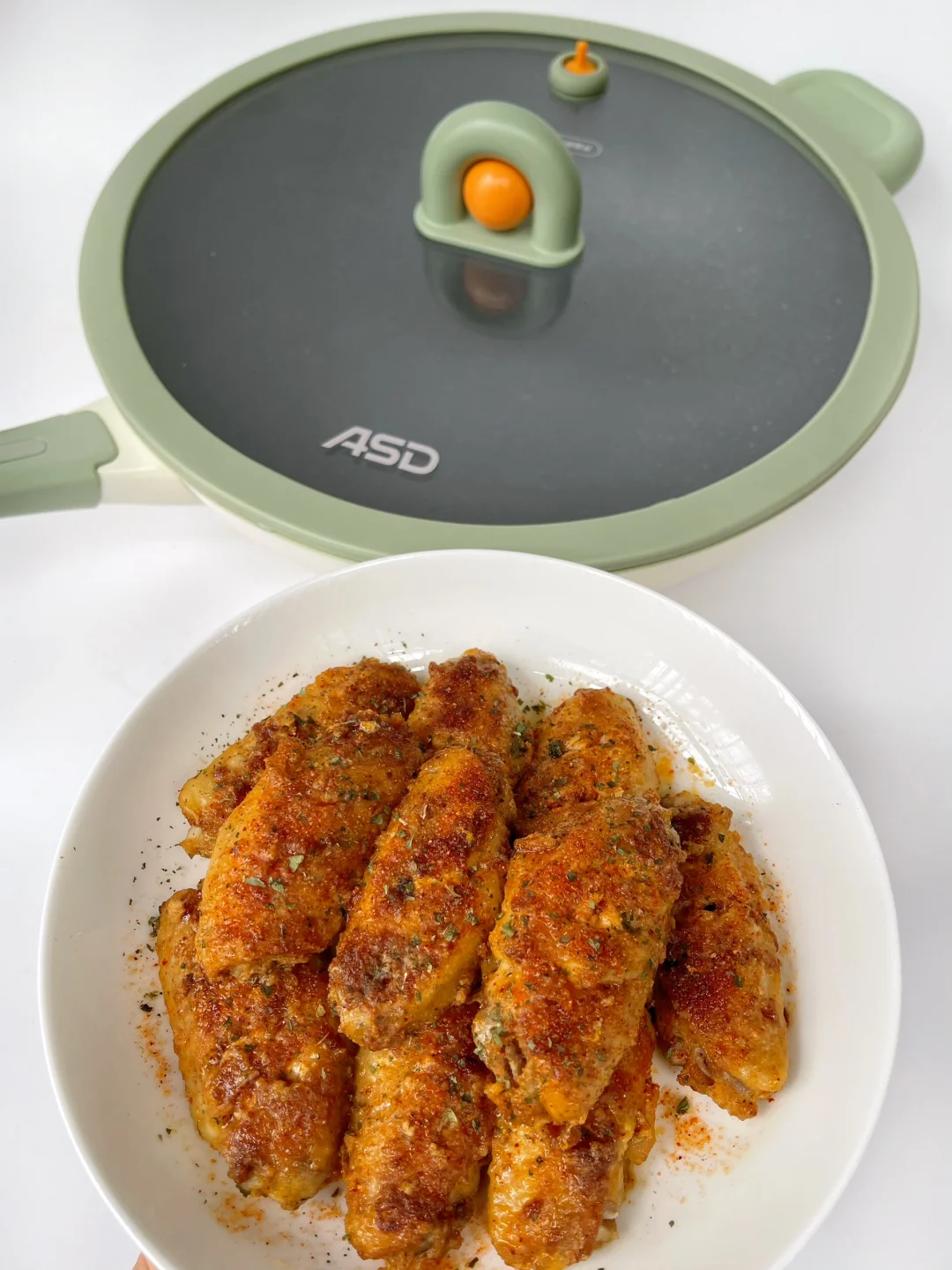 2️⃣起锅热油,小火把鸡翅煎至两面金黄,用筷子戳一下没有血水就是熟了,撒上椒盐粉就可以了!