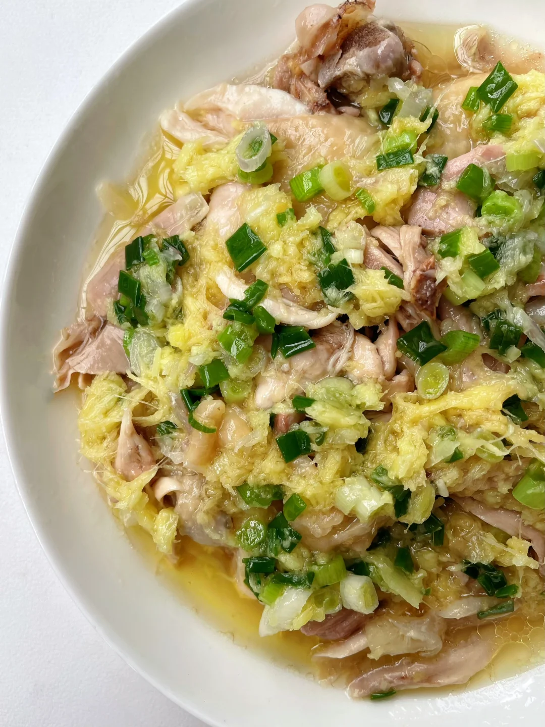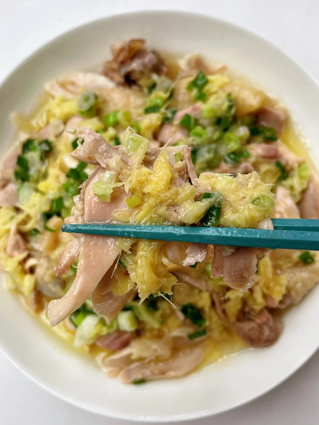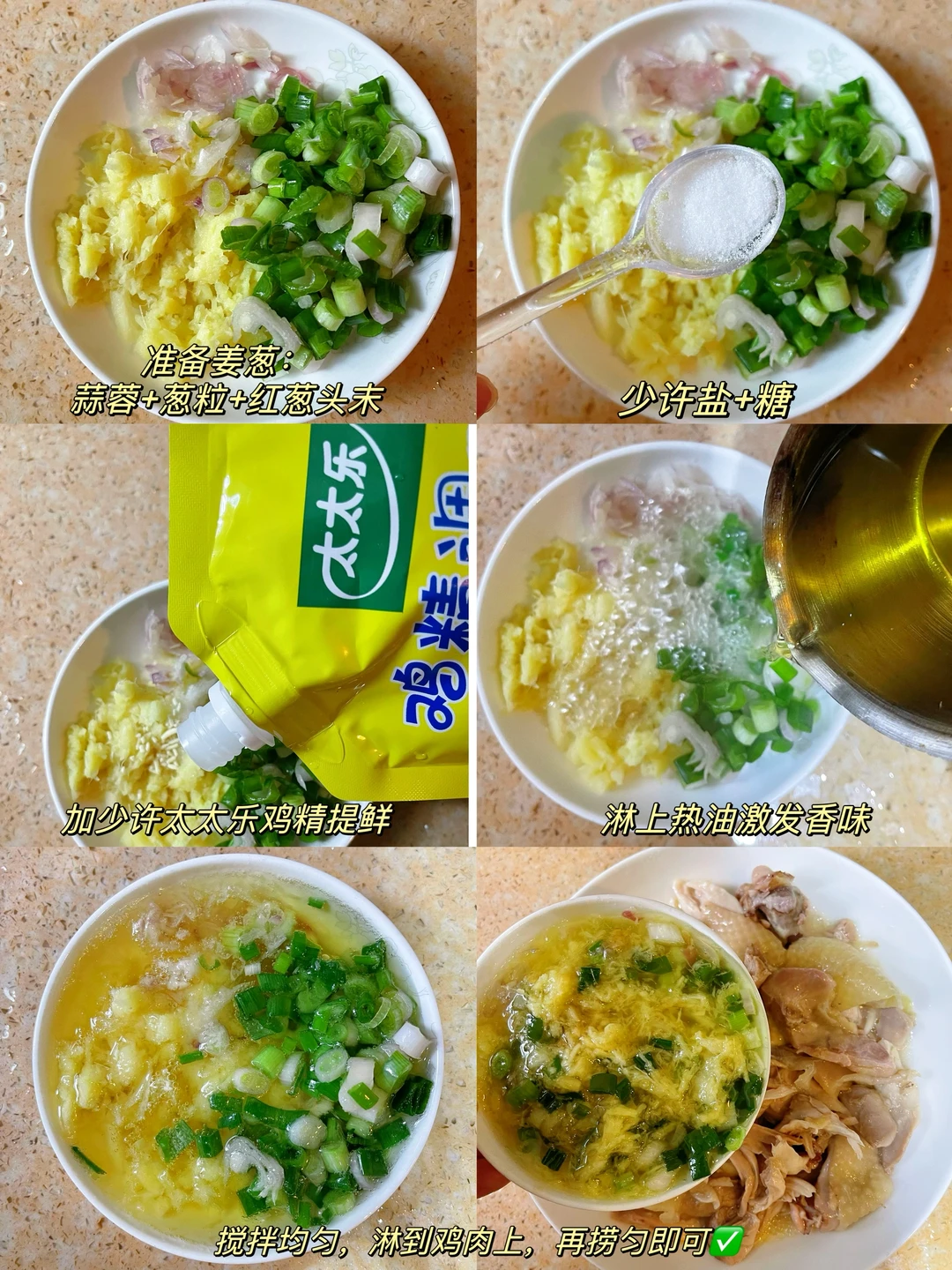 3⃣参考图片做个姜葱,淋到鸡肉上,捞匀即可✅