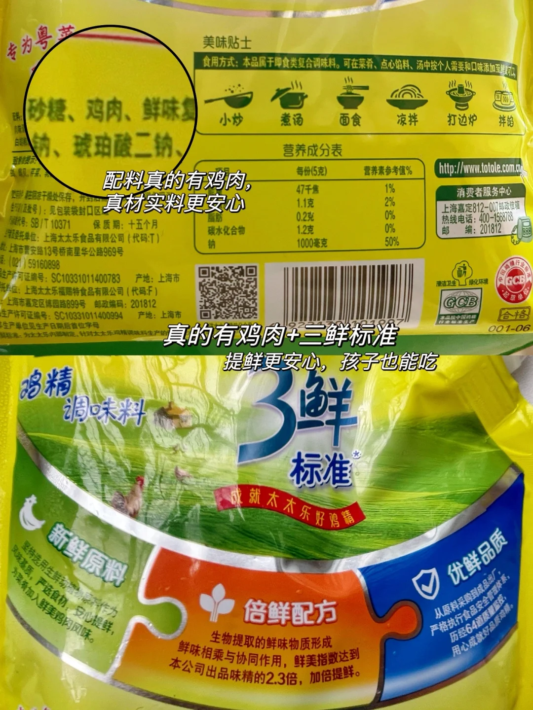🌿🌿🌿太太乐鸡精,30多年知名品牌,品质保障,吃得安心👍,真有鸡肉真的鲜,含有小葱、大蒜等生鲜原料,真材实料很安心~ 老人小孩都能吃❗