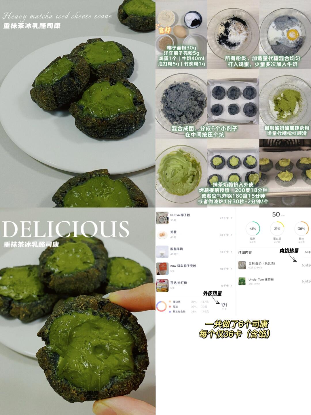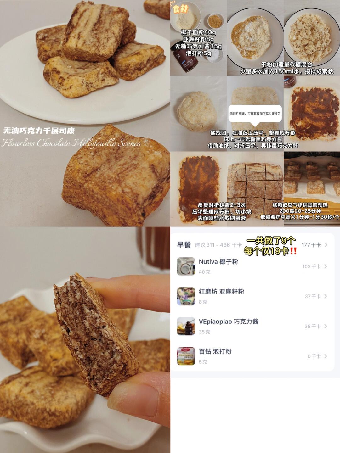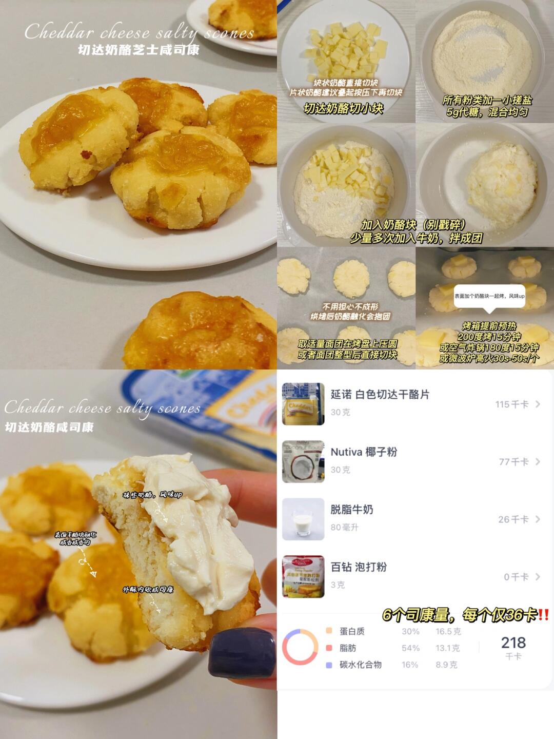 👩‍🍳【无面粉低卡司康】合集 💕无油,无面粉,9种风味,咸甜都有,总有你爱,每款都好吃好做不踩雷 🌈减脂、健身、控糖、低碳、生酮、司康、糕点爱好者都🐴住‼️ . 🔸巧克力燕麦司康(54卡/个) 🔸焦糖司康(37卡/个) 🔸切达奶酪芝士咸司康(36卡/个) 🔸摩卡可可冰乳酪司康(56卡/个) 🔸巧克力千层司康(19卡/个) 🔸桂花豆乳冰乳酪司康(38卡/个) 🔸酷黑抹茶冰乳酪司康(36卡/个) 🔸奥利奥冰乳酪司康(53卡/个) 🔸黑芝麻冰乳酪司康(59卡/个) . 📖简单步骤一看就会,每款都有对应笔记📝 . 食材简单,美味不简单‼️ 无面粉司康,口感更像糕点,咸口yyds,冰乳酪款冷藏风味更佳~很适合做新年聚会的健康糕点~ 🌈姐妹们都要多吃不胖!